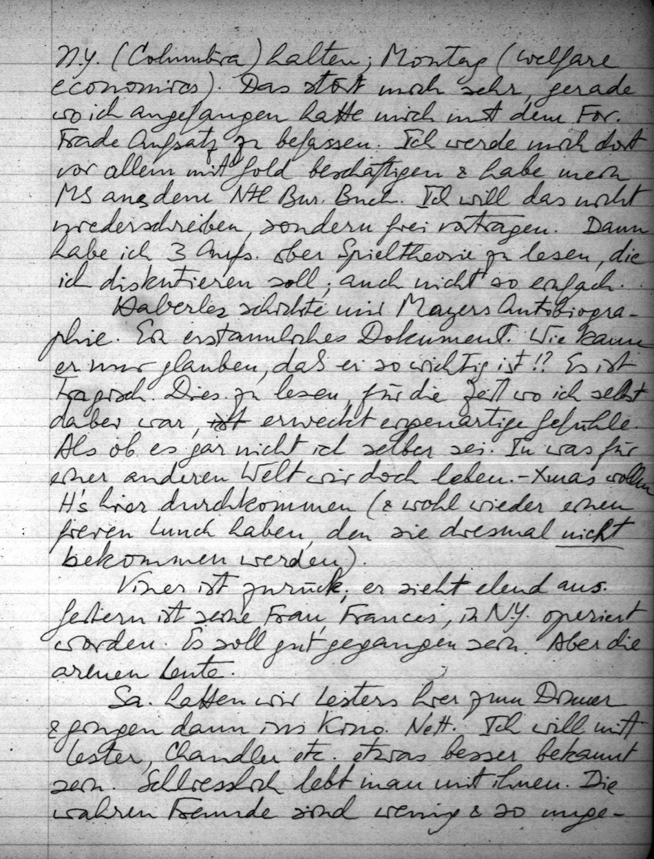Nun muß ich plötzlich einen Vortrag in N.Y. (Columbia) halten; Montag (Welfare economics). Das stört mich sehr, gerade wo ich angefangen hatte mich mit dem For. Trade Aufsatz zu befassen. Ich werde mich dort vor allem mit Gold beschäftigen & habe mein MS aus dem Ntl. Bur. Buch. Ich will das nicht niederschreiben, sondern frei vortragen. Dann habe ich 3 Aufs. über Spieltheorie zu lesen, die ich diskutieren soll; auch nicht so einfach.