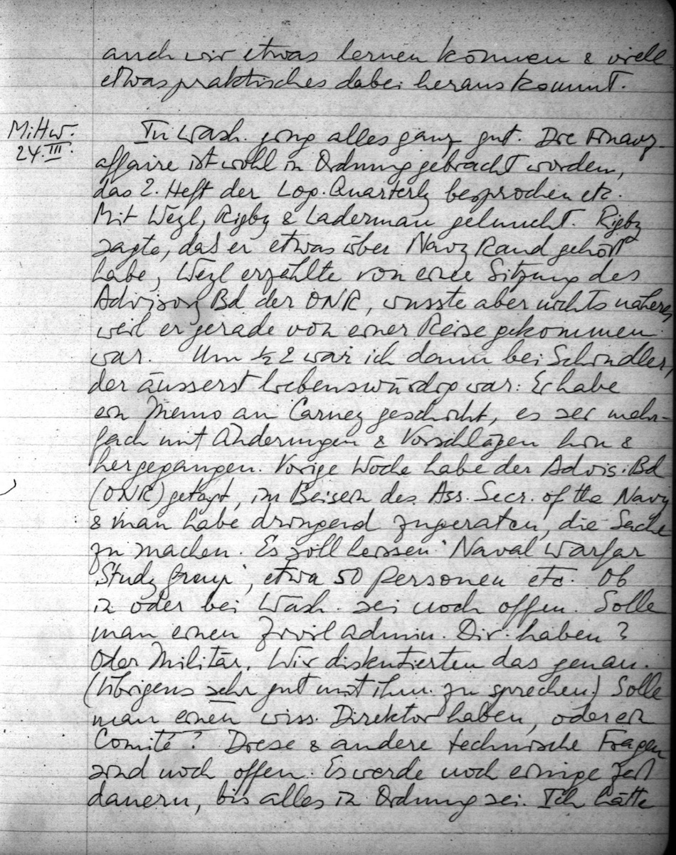 In Wash. ging alles ganz gut. Die Finanzaffaire ist wohl in Ordnung gebracht worden, das 2. Heft der Log. Quarterly besprochen etc. Mit Weyl, Rigby & Laderman geluncht. Rigby sagte, daß er etwas über Navy Rand gehört habe, Weyl erzählt von einer Sitzung des Advisory Bd der ONR, wusste aber nichts näheres, weil er gerade von einer Reise gekommen war. Um ½ 2 war ich dann bei Schindler, der äusserst liebenswürdig war: Er habe ein Memo an Carney geschickt, es sei mehrfach mit Änderungen & Vorschlägen hin & hergegangen. Vorige Woche habe der Advis. Bd (ONR) getagt, im Beisein des Ass. Secr. oft he Navy & man habe dringend zugeraten, die Sache zu machen. Es soll heissen "Naval Warfar Study Group", etwa 50 Personen etc. Ob in oder bei Wash. sei noch offen. Solle man einen Ziviladmin. Dir. haben? Oder Militär. Wir diskutierten das genau. (Übrigens sehr gut mit ihm zu sprechen.) Solle man einen wiss. Direktor haben, oder ein Comitè? Diese & andere technische Fragen sind noch offen. Es werde noch einige Zeit dauern, bis alles in Ordnung sei. Ich hätte wirklich etwas zustande gebracht und man sei sehr dankbar etc. Man werde mich bitten weiter zu helfen & wann immer ich nach Wash. komme, solle ich ihn besuchen. Dann noch eingehende Besprechung einiger Technischer Fragen, worüber ich nichts aufschreiben kann. Johnny wird sich freuen. Er hat seit meinem ersten Kontakt mit Schindler nicht daran gezweifelt, daß die Sache zustande kommen werde.
