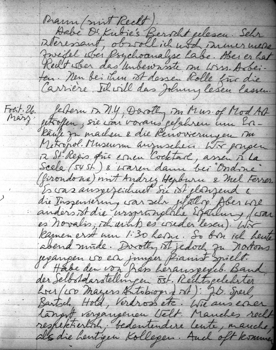 Die Einleitung ist noch nicht fertig. Aber bestimmt bis Montag. Morgen nachmittag nach N.Y. Dinner bei Jakob. Dann gehen D. & ich zu Ondine mit Andrey Hepburn. Sie soll so ausgezeichnet sein.