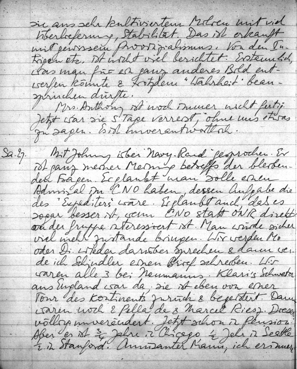 Gestern in N.Y.; Dorothy im Mus. of Mod. Art getroffen; sie war voraus gefahren um Einkäufe zu machen & die Renovierungen im Metropol. Museum anzusehen. Wir gingen in St. Regis für einen Cocktail, assen in La Scala (54 St.) & waren dann bei "Ondine" (Girondone) mit Audrey Hepburn & Mel Ferrer. Es war ausgezeichnet. Sie ist glänzend & die Inszenierung war sehr gefällig. Aber wie anders ist die ursprüngliche Erzählung; (war es Novalis; ich muß es wieder lesen). Wir kamen erst um 1.30 heim. So bin ich heute abend müde. Dorothy ist jedoch zu Nortons gegangen wo ein junger Pianist spielt.