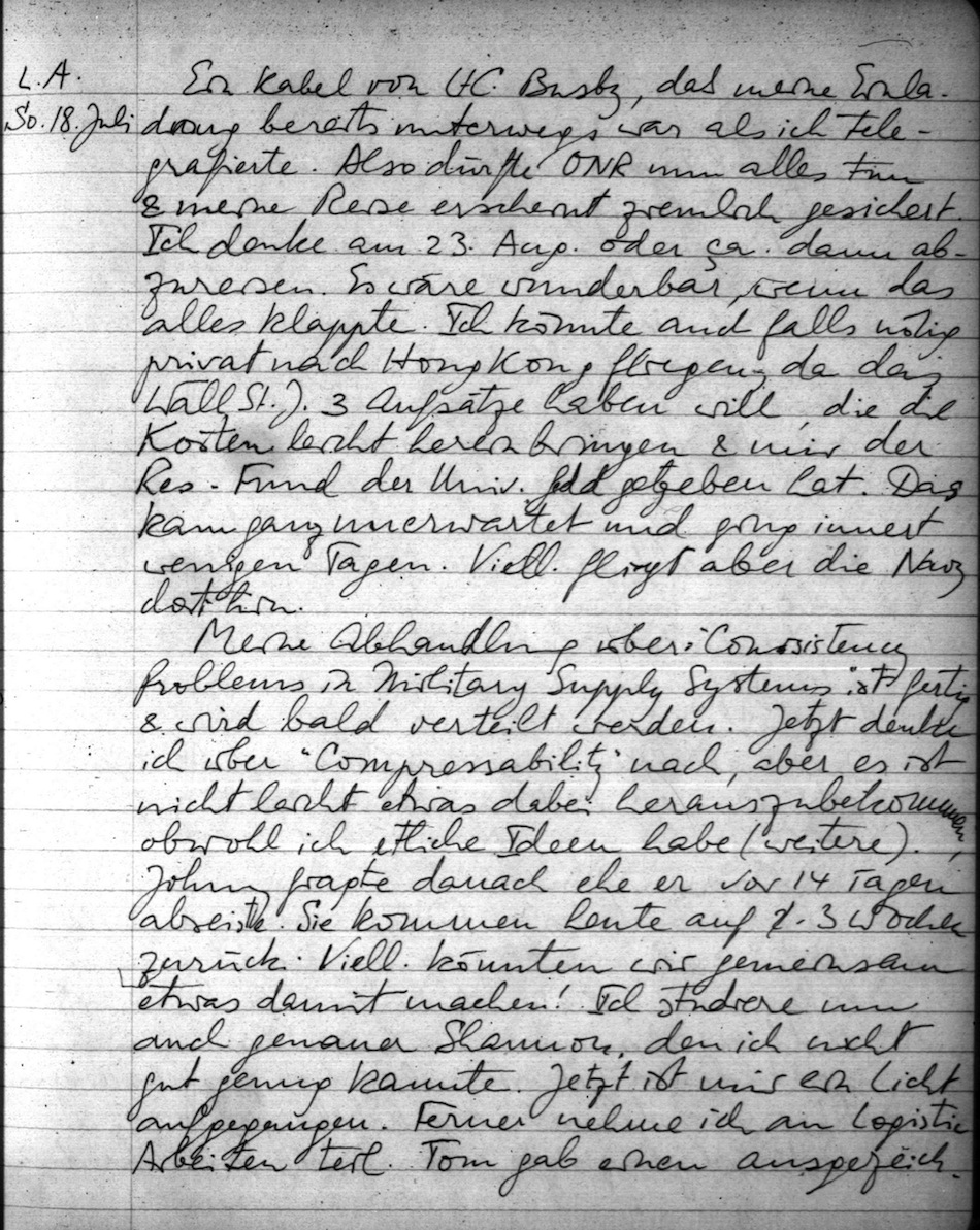 Meine Abhandlung über "Consistency Problems in Military Supply Systems" ist fertig & wird bald verteilt werden. Jetzt denke ich über "Compressability" nach, aber es ist nicht leicht etwas dabei herauszubekommen, obwohl ich etliche Ideen habe (weitere). Johnny fragte danach ehe er vor 14 Tagen abreiste. Sie kommen heute auf 2-3 Wochen zurück. Viell. könnten wir gemeinsam etwas damit machen! Ich studiere nun auch genauer Shannon, den ich nicht gut genug kannte. Jetzt ist mir ein Licht aufgegangen. Ferner nehme ich an Logistic Arbeiten teil. Tom gab einen ausgezeichneten Bericht und machte überhaupt einen guten Eindruck.