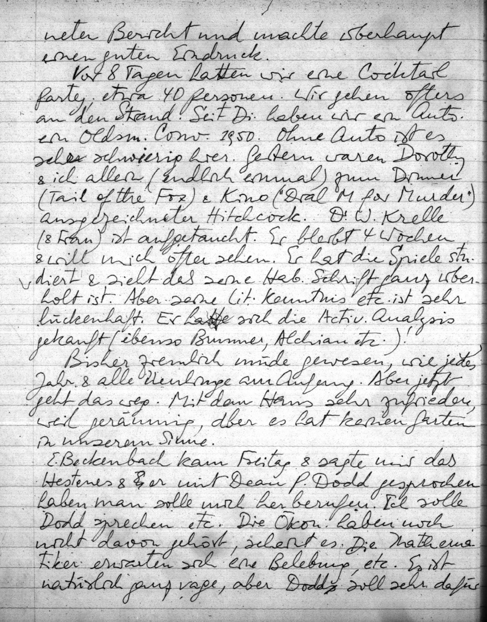 Vor 8 Tagen hatten wir eine Cocktail Party; etwa 40 Personen. Wir gehen öfters an den Strand. Seit Di. haben wir ein Auto, ein Oldsm. Conv. 1950. Ohne Auto ist es sehr schwierig hier. Gestern waren Dorothy & ich allein (endlich einmal) zum Dinner (Tail of the Fox) & Kino ("Dial M for Murder"), ausgezeichneter Hitchcock. Dr. W. Krelle (& Frau) ist aufgetaucht. Er bleibt 4 Wochen & will mich öfter sehen. Er hat die Spiele studiert & sieht das seine Hab. Schrift ganz überholt ist. Aber seine Lit. Kenntnis etc. ist sehr lückenhaft. Er hatte sich die Activ. Analysis gekauft (ebenso Brunner, Alchian etc.)!