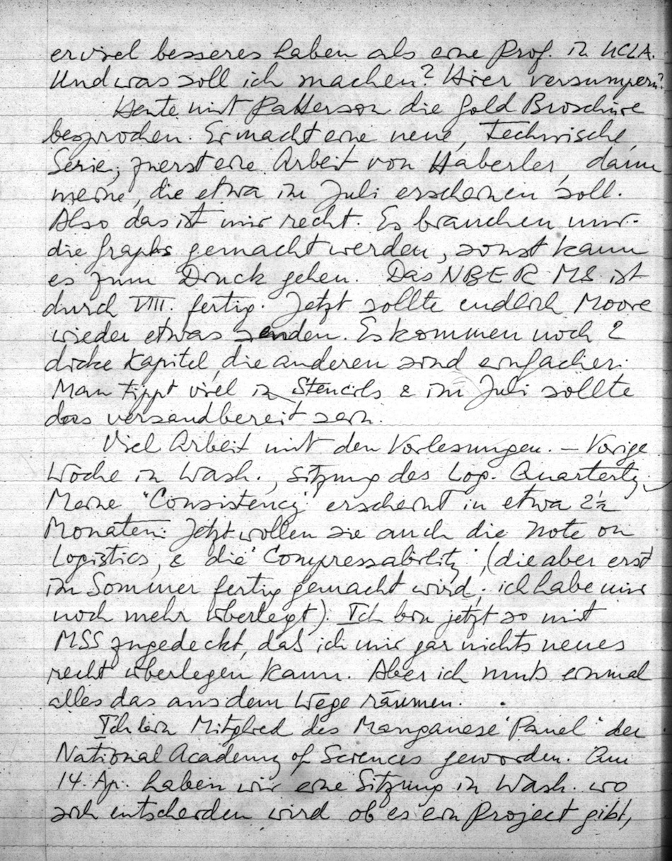 Heute mit Patterson die Gold Broschüre besprochen. Er macht eine neue, technische Serie; zuerst eine Arbeit von Haberler, dann meine, die etwa im Juli erscheinen soll. Also das ist mir recht. Es brauchen nur die Graphs gemacht werden, sonst kann es zum Druck gehen. Das NBER MS ist durch VIII. fertig. Jetzt sollte endlich Moore wieder etwas senden. Es kommen noch 2 Dicke Kapitel, die anderen sind einfacher. Man tippt viel in Stencils & im Juli sollte das versandbereit sein.