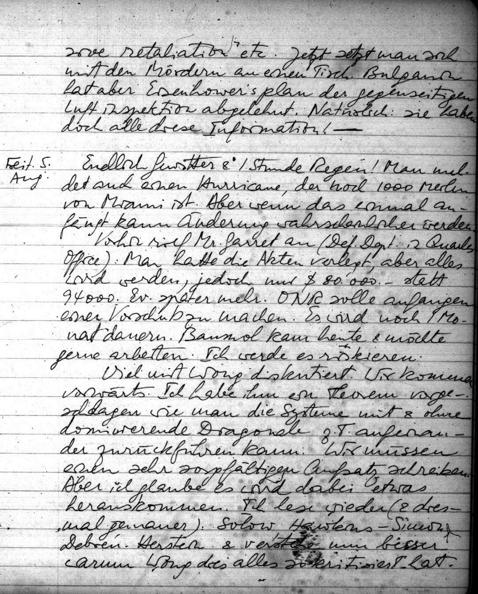 Vorhin rief Mr. Garret an (Def. Dept. in Quailes Office): Man hat die Akten verlegt, aber alles wird werden; jedoch nur $ 80.000,- statt 94.00,- Ev. später mehr. ONR solle anfangen einen Vorschub zu machen. Es wird noch1 Monat dauern. Ich werde es riskieren.