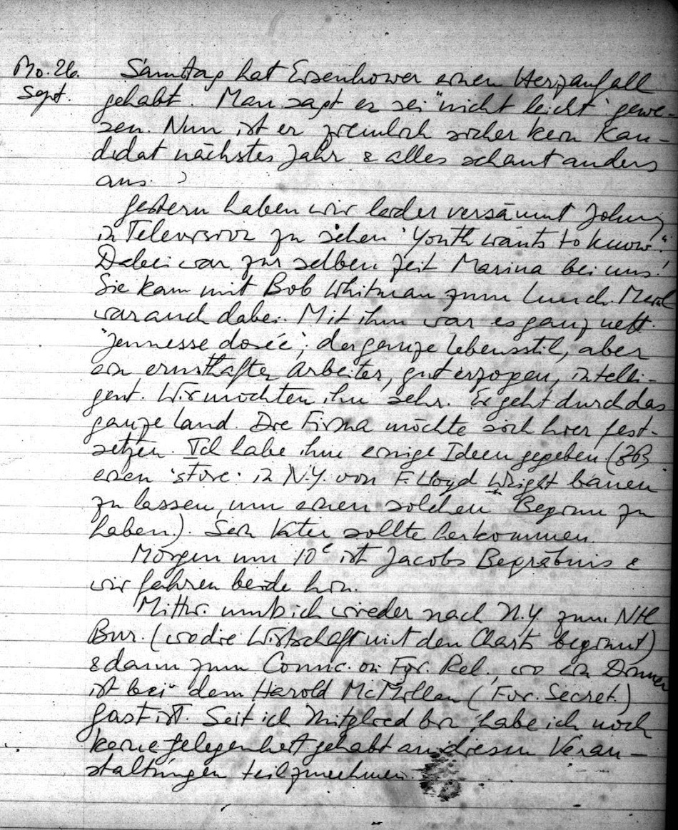 Gestern haben wir leider versäumt Johnny in Television zu sehen. "Youth wants to know". Dabei war zur selben Zeit Marina bei uns! Sie kam mit Mob Whitman zum Lunch. Meinl war auch dabei. Mit ihm war es ganz nett. "Jennesse dosée"; der ganze Lebensstil, aber ein ernsthafter Arbeiter, gut erzogen, intelligent. Wir mochten ihn sehr. Er geht durch das ganze Land. Die Firma möchte sich hier festsetzen. Ich habe ihm einige Ideen gegeben (z.B. einen "store" in N.Y. von F. Lloyd Wright bauen zu lassen, um einen solchen Beginn zu haben). Sein Vater sollte herkommen.