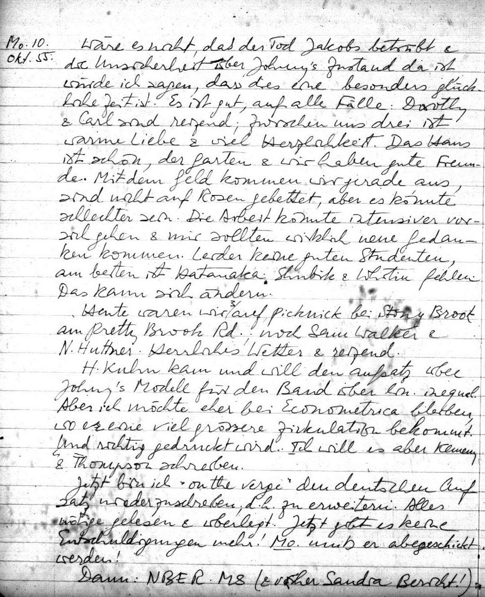Wäre es nicht, daß der Tod Jakobs betrübt & die Unsicherheit über Johnny's Zustand da ist, würde ich sagen, dass dies eine besonders glückliche Zeit ist. Es ist gut, auf alle Fälle: Dorothy & Carl sind reizend; zwischen uns drei ist warme Liebe & viel Herzlichkeit. Das Haus ist schön, der Garten & wir haben gute Freunde. Mit dem Geld kommen wir gerade aus, sind nicht auf Rosen gebettet, aber es könnte schlechter sein. Die Arbeit könnte intensiver vor sich gehen & mir sollten wirklich neue Gedanken kommen. Leider keine guten Studenten, am besten ist Hatanaka. Shubik & Whitin fehlen. Das kann sich ändern.
