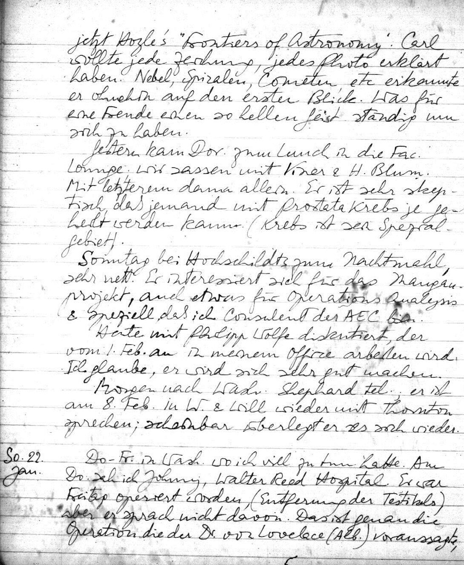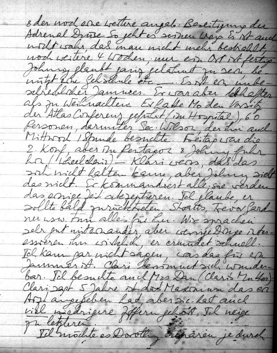 Do-Fr. in Wash. wo ich viel zu tun hatte. Am Do. sah ich Johnny, Walter Read Hospital. Er war Freitag operiert worden (Entfernung der Testikels), aber er sprach nicht davon. Das ist genau die Operation die der Dr von Lovelace (Alb.) voraussagte, & der noch eine weitere angeb. Beseitigung der Adrenal Drüse. So geht es seinen Weg. Es ist auch nicht war, daß man nicht mehr bestrahlt, noch weitere 4 Wochen; nur ein Ort ist fertig. Johnny glaubt ganz gelähmt zu sein, benützt eine Gehschule etc. Es ist ein unbeschreiblicher Jammer. Er war aber lebhafter als zu Weihnachten. Er hatte Mo. den Vorsitz der Atlas Conferenz geführt (im Hospital), 60 Personen, darunter Sec. Wilson, der ihn auch Mittwoch 1 Stunde besuchte. Freitag war die 2. Konf., aber im Pentagon & Johnny fuhr hin (wheel chair). Klari weiss, daß das sich nicht halten kann, aber Johnny sieht das nicht. Er kommandiert alle; sie werden das einige Zeit akzeptieren. Straus, Trevor Gardner usw. tun alles für ihn. Wir sprachen sehr gut miteinander, aber wenige Dinge interessieren ihn wirklich, er ermüdet schnell. Ich kann gar nicht sagen, was das für ein Jammer ist. Clari benimmt sich wunderbar. Ich besuchte auch Mrs. Dan (Clari's Mutter). Clari sagt, 5 Jahre ist das Maximum das ein Arzt angegeben hat, aber sie hat auch viel niedrigere Ziffern gehört. Ich neige zu letzteren.