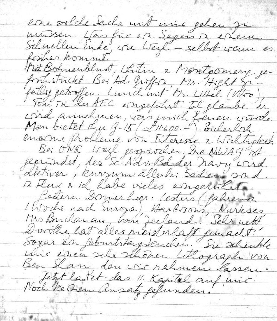 Mit Bohnenblust, Whitin & Montgomery gefrühstückt. Bei Ad. Griffin, Mr. Hight zufällig getroffen. Lunch mit Mr. Littel (Vitro), Tom in der AEC eingeführt. Ich glaube er wird annehmen, was mich freuen würde. Man bietet ihm G-15 (= $ 11.600,-). Sicherlich enorme Probleme von Interesse und Wichtigkeit.