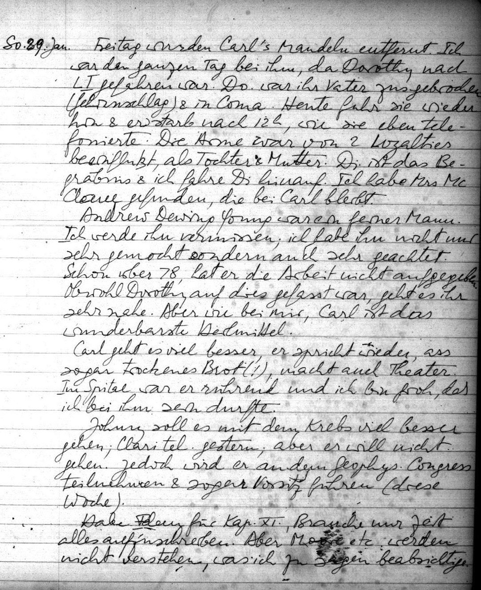 Freitag wurden Carl's Mandeln entfernt. Ich war den ganzen Tag bei ihm, da Dorothy nach LI gefahren war. Do. war ihr Vater zus.gebrochen (Gehirnschlag) & in Coma. Heute fuhr sie wieder hin & er starb nach 12h, wie sie eben telefonierte. Die Arme war von 2 Lozalties beeinflußt, als Tochter & Mutter. Di. ist das Begräbnis & ich fahre Di. hinauf. Ich habe Mrs. McLane gefunden, die bei Carl bleibt.