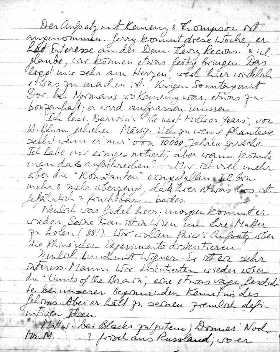 Neulich Lunch mit Wigner. Er ist ein sehr interess. Mann. Wir diskutierten wieder über die "Limits of Brain", eine etwas vage Geschichte bei unserer beginnenden Kenntnis des Gehirns. Aber er hält zu seinen ziemlich definitiven Ideen.