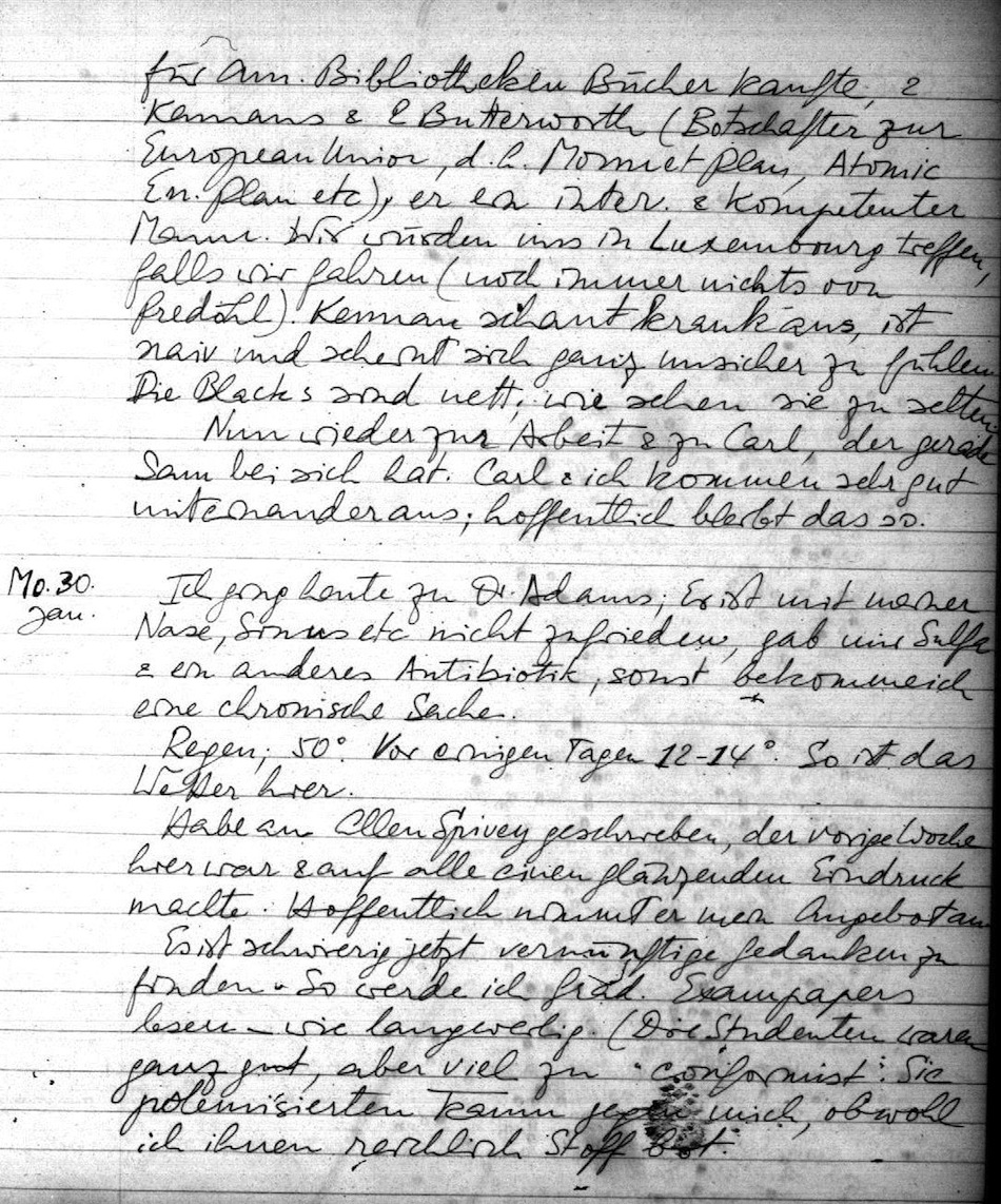 Mittw. bei Blacks zu (gutem) Dinner. Noch Mr. M ? frisch aus Russland, wo er für Am. Bibliotheken Bücher kaufte; 2 Kamans & 2 Buttersworth (Botschafter zur European Union, d.h. Mormet Plan, Atomic En. Plan etc.); er ein inter. & kompetenter Mann. Wir würden uns in Luxembourg treffen, falls wir fahren (noch immer nichts von Predohl). Keman schaut krank aus, ist naiv und scheint sich ganz unsicher zu fühlen. Die Black's sind nett; wir sehen sie zu selten.