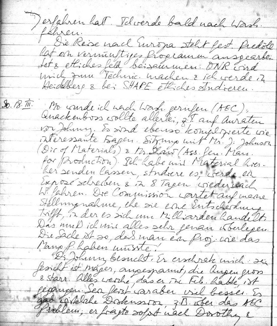 Ich war in Wash., Sitzung NRLQ, Manganese etc. AEC; bei Johnny & es war sehr, sehr traurig, so daß ich am liebsten nicht daran denken möchte. Jedoch ist der letzte Befund besser. Wir tel. miteinander & zum ersten Male in Monaten klang er fest, zuversichtlich. Die X-rays haben aufgehört & man gibt ihm weniger Schlafmittel, die ihn offenbar deprimiert haben. Sein Appetit ist auch besser. Also viell. tritt ein, was Mr. Poole von Sandia erfahren hat. Ich werde bald nach Wash. fahren.