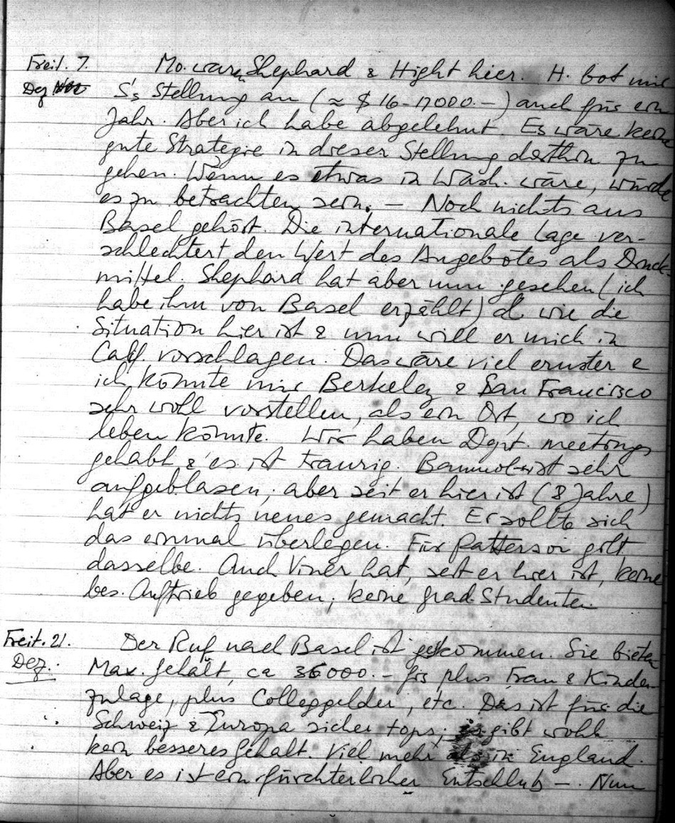 Mo. waren Shephard & Hight hier. H. bot mir S's Stelle an ( $ 16-17000,-) auch für ein Jahr. Aber ich habe abgelehnt. Es wäre keine gute Strategie in dieser Stellung dorthin zu gehen. Wenn es etwas in Wash. wäre, würde es zu betrachten sein. Noch nichts aus Basel gehört. Die internationale Lage verschlechtert den Wert des Angebotes als Druckmittel. Shephard hat aber nun gesehen (ich habe ihm von Basel erzählt) wie die Situation hier ist & nun will er mich in Calif. vorschlagen. Das wäre viel ernster & ich könnte mir Berkeley & San Francisco sehr wohl vorstellen, als ein Ort, wo ich leben könnte. Wir haben Dept. meetings gehabt & es ist traurig. Baumol ist sehr aufgeblasen; aber seit er hier ist (8 Jahre) hat er nichts neues gemacht. Er sollte sich das einmal überlegen. Für Patterson gilt dasselbe. Auch Viner hat, seit er hier ist, keinen bes. Auftrieb gegeben; keine Grad. Studenten.