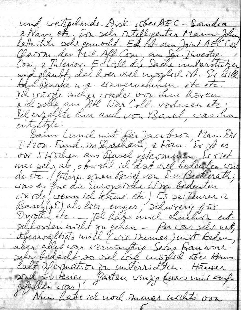 Dann Lunch mit Per Jacobson, Man. Dir. I. Mon. Fund., im Shaeham, & Frau. Er ist erst vor 5 Wochen aus Basel gekommen. Er riet mir sehr ab, obwohl ich dort viel bedeuten würde etc. (Gestern einen Brief von E. v. Beckerath; was es für die Europäische Wiss. bedeuten würde, wenn ich käme etc.) Es sei teurer in Basel (z.T.) als hier, enger, schwierig für Dorothy etc. Ich habe mich ohnehin entschlossen nicht zu gehen. Per war sehr nett, überwältige mich (wie immer) mit Reden, aber alles war vernünftig. Seine Frau war sehr bedacht so viel wie möglich über Haushaltinformation zu unterrichten. Häuser sind so teuer, Gärten winzig (was mir aufgefallen war).