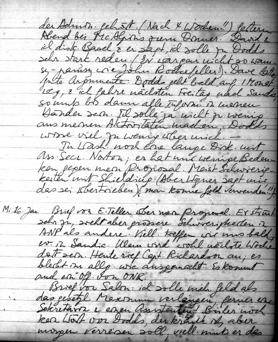 Di. fuhr ich nach Washington. Am Mitt. auch eine fast 2 stündige Besprechung mit Sen. A. Jackson (Wash.) über meine Navy Pläne, und weitgehende Disk. über AEC Sandia & Navy etc. Ein sehr intelligenter Mann. Johnny hatte ihn sehr gemocht. Er ist am Joint AEC Con. Chairm. des Mil. Aff. Com., am Sen. Investig. Com. & Interior. Er will die Sache unterstützten und glaubt, daß hier viel möglich ist. Er will Adm. Burke u.a. einvernehmen etc. etc. Ich würde sicher wieder von ihm hören & ich soll am Ntl. War Coll. vorlesen etc. Ich erzählt ihm auch von Basel, was ihn entsetzte.