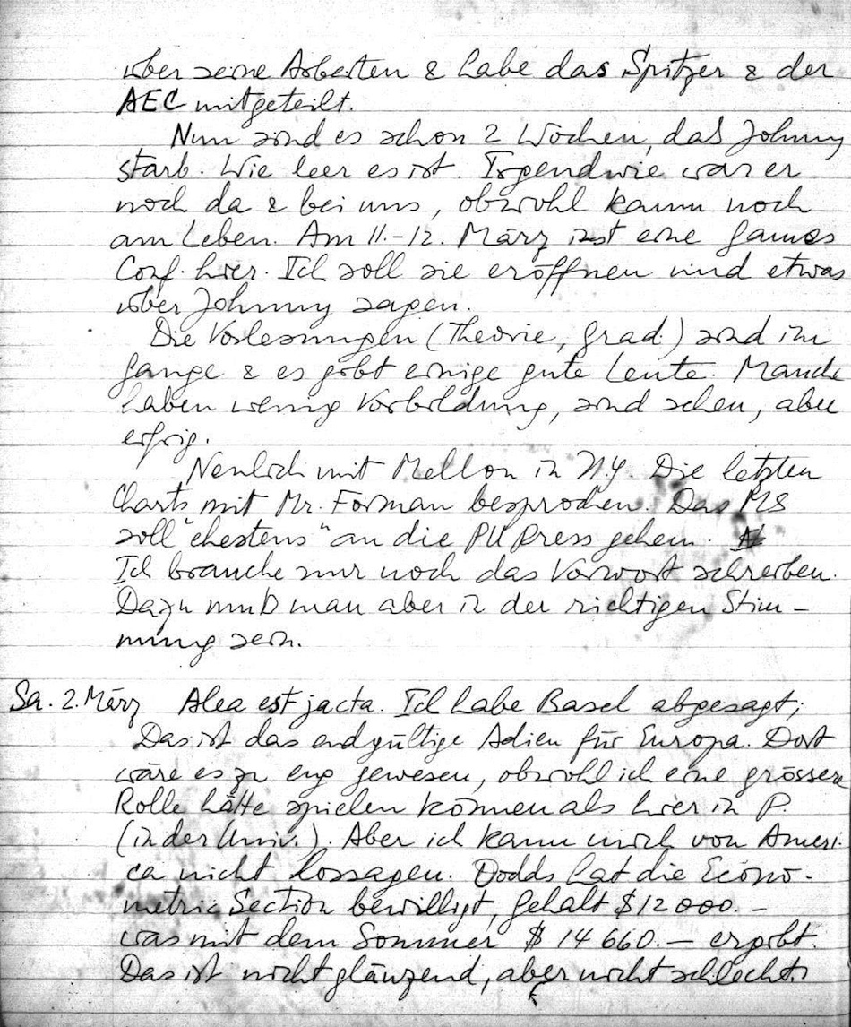 Alea est jacta. Ich habe Basel abgesagt; Das ist das endgültige Adieu für Europa. Dort wäre es zu eng gewesen, obwohl ich eine grössere Rolle hätte spielen können als hier in P. (in der Univ.). Aber ich kann mich von America nicht lossagen. Dodds hat die Econometrica Section bewilligt, Gehalt $ 12 000,-, was mit dem Sommer $ 14 660,- ergibt. Das ist nicht glänzend, aber nicht schlecht. Bei diesem Einkommen möchte ich alles was ich darüber verdiene (AEC, Sandia etc.) investieren. (Ich habe jetzt, abgesehen von Anteil im Haus (etwa netto $ 35000,-), in Versicherungen; etwa $ 7000,- + für Anlagen).