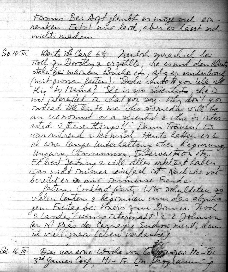 Heute ist Carl 6 ½. Neulich sprach ich bei Tisch zu Dorothy & erzählte, wie es mit den Charts stehe bei meinem Buche etc., als er unterbrach (mit grossen Gesten): "Dada why do you tell all this to Mama? She is no scientists, she is not intereited in what you say. Why don'd you instead tell this to me who someday will be an economist or a scientist & who is interested in these things?!" Dann Tränen! Es war rührend und komisch. Heute hatten er & ich eine lange Unterhaltung über Regierung, Ungarn, Communism, Intervention etc. Er liest Zeitung & will alles erklärt haben, was nicht immer einfach ist. Nach wie vor bereitet er mir immense Freude.