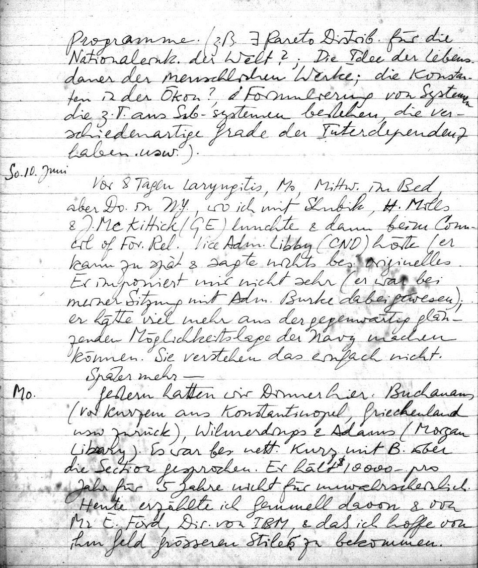 Vor 8 Tagen Laryngitis, Mo., Mittw. im Bed, aber Do. in N.Y., wo ich mit Shubik, H. Mills & J. McKittick (GE) lunchte & dann beim Council of For. Rel. Vice Adm. Libby (CNO) hörte (er kam zu spät & sagte nichts bes. originelles. Er imponiert mir nicht sehr (er war bei meiner Sitzung mit Adm. Burke dabei gewesen); er hätte viel mehr aus der gegenwärtig glänzenden Möglichkeitslage der Navy machen können. Sie verstehen das einfach nicht.