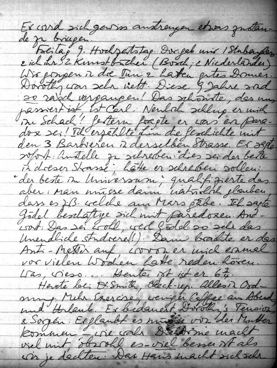 Freitag 9. Hochzeitstag. Dor. gab mir 1 Steubenglas & ich ihr 2 Kunstbücher (Bosch; & Niederländer). Wir gingen in die Inn & hatten gutes Dinner. Dorothy war sehr nett. Diese 9 Jahre sind so rasch vergangen! Das schönste, das uns passiert ist, ist Carl. Neulich schlug er mich im Schach! Gestern fragte er was ein Paradox sei! Ich erzählte ihm die Geschichte mit den 3 Barbieren in derselben Strasse. Er sagte sofort: Anstelle zu schreiben: "dies sei der beste in dieser Strasse", hätte er schreiben sollen: "der beste im Universum", qualifizierte das aber: man müsse dann natürlich glauben, dass es z.B. welche am Mars gäbe. Ich sagte Gödel beschäftige sich mit Paradoxen. Antwort: Das sei wohl, weil Gödel so sehr das Unendliche studiere!!). Dann bracht er das Anti-Metter auf, wovon er mich einmal vor vielen Wochen hatte reden hören. Was, wieso Heute ist er 6 ¾.