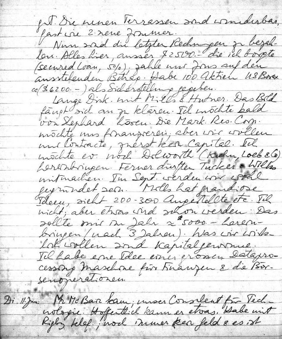 Lange Disk. mit Mills & Huttner. Das Bild fängt sich an zu klären. Ich möchte bald von Shephard hören. Die Mark. Res. Corp. möchte uns finanzieren; aber wollen nur Contracte, zuerst kein Capital. Ich möchte ev. noch Dilworth (Kuhn, Loeb & Co) hereinbringen. Ferner dürften Tucker & Wilks mitmachen. Im Sept. werden wir wohl gegründet sein. Mills hat grandiose Ideen, sieht 200-300 Angestellt etc. Ich nicht; aber etwas wird schon werden. Das sollte mir im Jahr $ 5000,- hereinbringen (nach 3 Jahren). Was wir wirklich wollen sind Kapitalgewinne. Ich habe eine Idee einer grossen Dataprocessing Maschine für Finanzen & die Börsenoperationen.