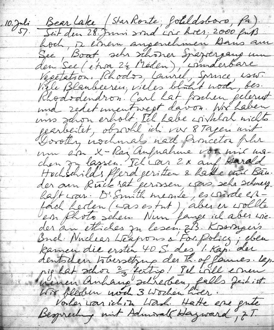 Bear Lake (Star Route; Gouldsboro, Pa.). Seit dem 28. Juni sind wir hier; 2000 Fuß hoch, in einem angenehmen Haus am See, Boot, sehr schöner Spaziergang um den See (etwa 2 ½ Meilen), wunderbare Vegetation. Rhodos, Laurel, Spruce, usw. Viele Blaubeeren; vieles blüht noch, bes. Rhododendron. Carl hat fischen gelernt und redet unentwegt davon. Wir haben uns schon erholt. Ich habe wirklich nichts gearbeitet, obwohl ich vor 8 Tagen mit Dorothy nochmals nach Princeton fuhr um ein X-Ray Aufnahme von mir machen zu lassen. Ich war 2 x auf Harold Hochschild's Pferd geritten & hatte mir Bänder am Rückgrat gerissen, was sehr schmerzhaft war. Dr Smith meinte, es würde einfach heilen (was es tut), aber er wollte ein Photo sehen. Nun fange ich aber wieder an etliches zu lesen; z.B. Kissinger's Buch: Nuclear Weapons & For. Policy; eben kamen die ersten 40 S. des 1. Kap. der deutschen Übersetzung der Th. of Games. Leppig hat schon 2/3 fertig! Ich will einen neuen Anhang schreiben, falls Zeit ist. Wir bleiben noch 3 Wochen hier.