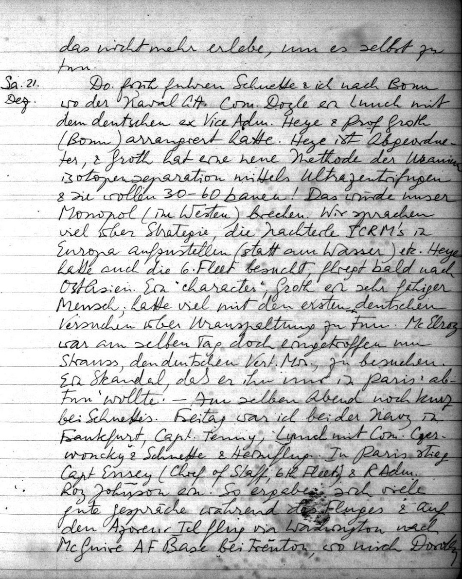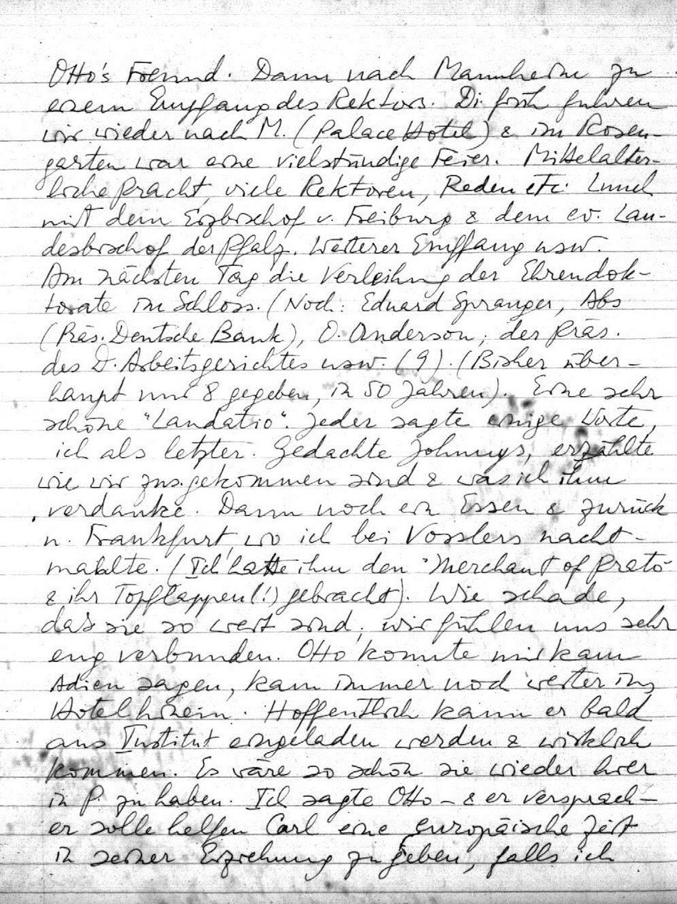 Mo. wurde ich von Waffenschmidt zum Tee eingeladen (noch Heun & der Philosoph Gadena (??) Otto's Freund. Dann nach Mannheim zu einem Empfang des Rektors. Di. früh fuhren wir wieder nach M. (Palace Hotel) & im Rosengarten war eine vielstündige Feier. Mittelalterliche Pracht, viele Rektoren, Reden etc. Lunch mit dem Erzbischof v. Freiburg & dem ev. Landesbischof der Pfalz. Weiterer Empfang usw. Am nächsten Tag die Verleihung der Ehrendoktorate im Schloss. (Noch. Eduard Spranger, Abs (Präs. Deutsche Bank), O. Anderson; der präs. des D. Arbeitsgerichtes usw. (9). (Bisher überhaupt nur 8 gegeben, in 50 Jahren). Eine sehr schöne "Laudatio". Jeder sagte einige Worte, ich als letzter. Gedachte Johnnys, erzählte wie wir zus.gekommen sind & was ich ihm verdanke. Dann noch ein Essen & zurück n. Frankfurt, wo ich bei Vosslers nachtmahlte. (Ich hatte ihm den "Merchant of Prato" & ihr Topflappen (!) gebracht). Wie schade, daß sie so weit sind, wir fühlen uns sehr eng verbunden. Otto konnte mir kaum Adieu sagen, kam immer noch weiter ins Hotel hinein. Hoffentlich kann er bald ans Institut eingeladen werden & wirklich kommen. Es wäre so schön sie wieder hier in P. zu haben. Ich sagte Otto - & er versprach er solle helfen Carl eine europäische Zeit in seiner Erziehung zu geben, falls ich das nicht mehr erlebe, um es selbst zu tun.