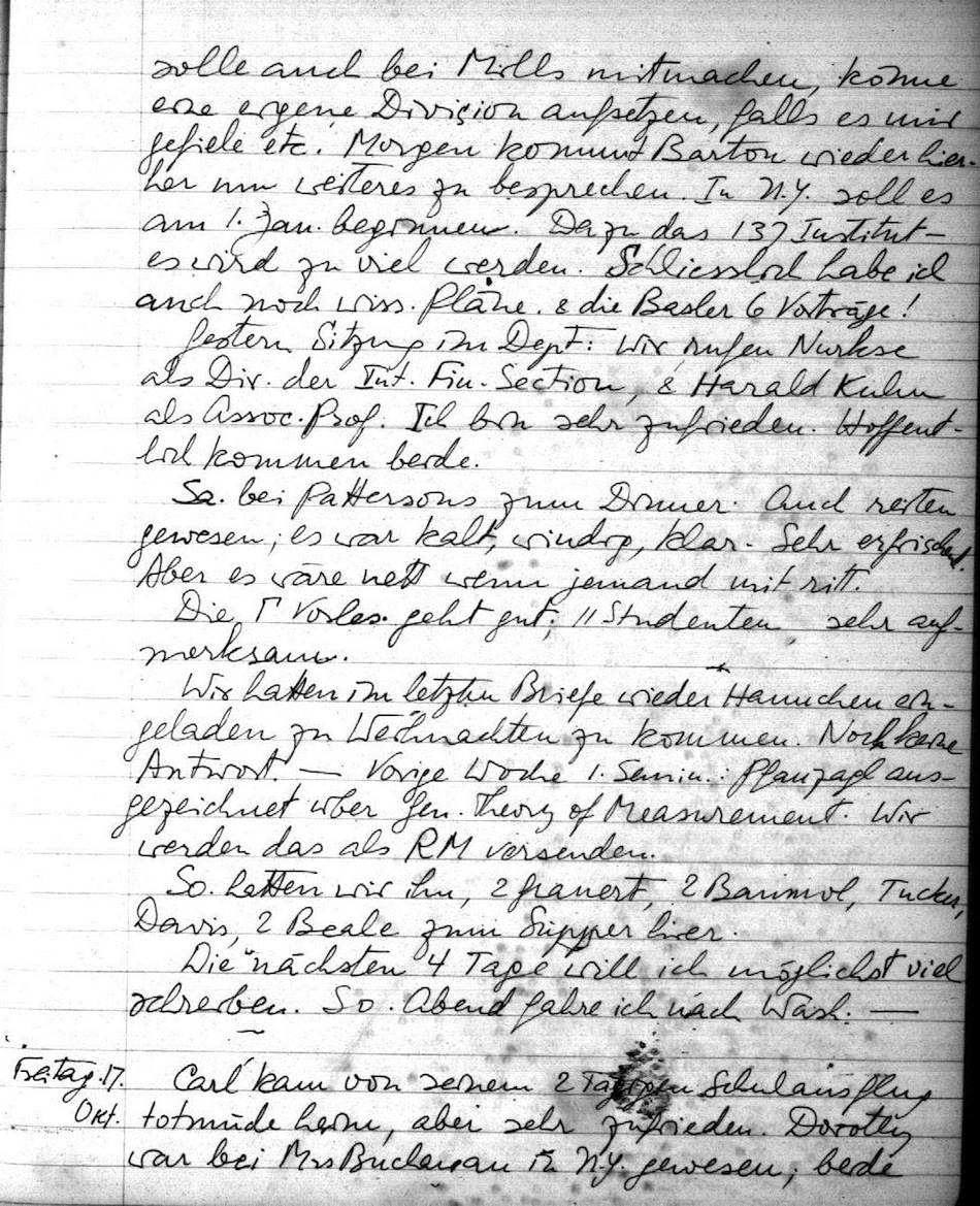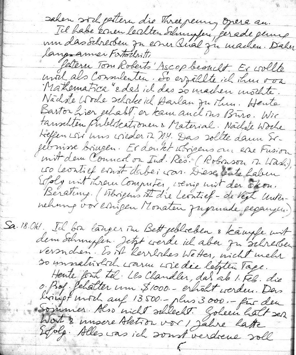 Gestern Tom Roberts' Ascop besucht. Er wollte mich als Consulenten. So erzählte ich ihm von "Mathematica" & daß ich das so machen möchte. Nächste Woche schicke ich Aarlan zu ihm. Heute Barton hier gehabt; er kam auch ins Büro. Wir tauschten Publikationen & Material. Nächste Woche treffen wir uns wieder in N.Y. Das sollte dann Ergebnisse bringen. Er denkt übrigens an eine Fusion mit dem Council on Ind. Res. (Robinson in Wash.), wo Leontief einst dabei war. Diese Leute haben Erfolg mit ihrem Computer, wenig mit der ökon. Beratung. (Übrigens ist die Leontief-de Vegh Unternehmung vor einigen Monaten zugrunde gegangen.)