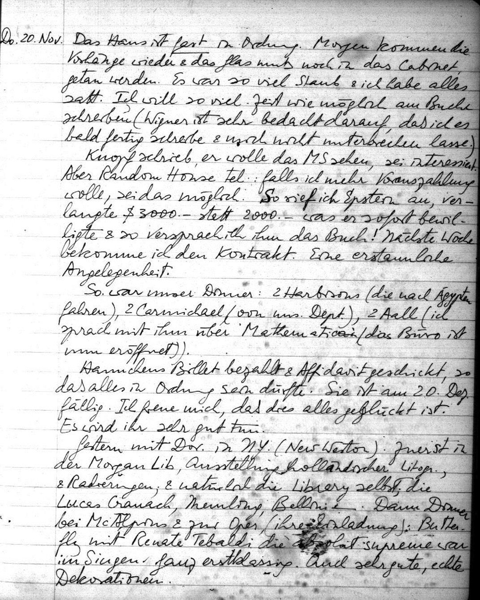 Knopf schrieb, er wolle das MS sehen, sei interessiert. Aber Random House tel.: falls ich mehr Vorauszahlung wolle, sei das möglich. So rief ich Epstein an, verlangte $ 3000,- statt 2000,- was er sofort bewilligte & so versprach ich ihm das Buch! Nächste Woche bekomme ich den Kontrakt. Eine erstaunliche Angelegenheit.