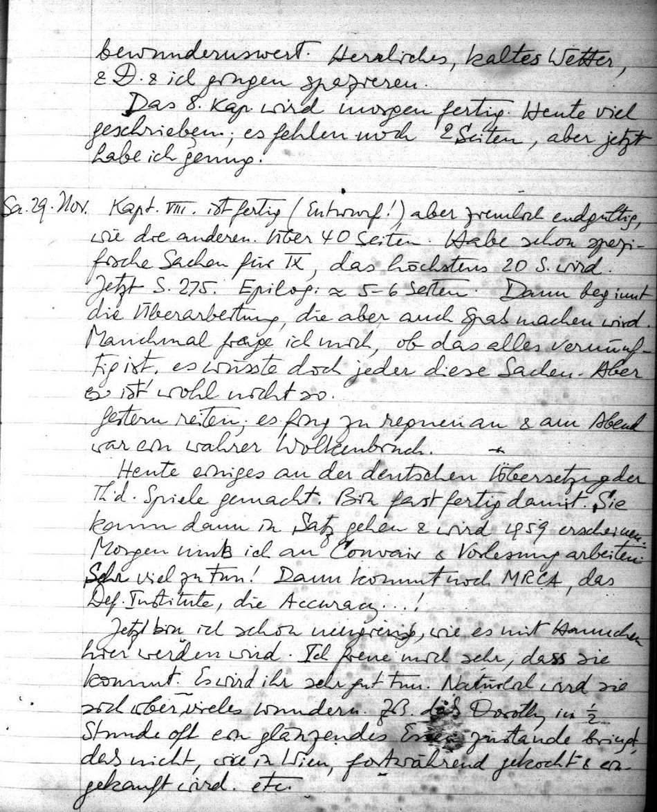 Kapt. VIII. ist fertig (Entwurf!) aber ziemlich endgültig, wie die anderen. Über 40 Seiten. Habe schon spezifische Sachen für IX, das höchstens 20 S. wird. Jetzt S. 275. Epilog: 5-6 Seiten. Dann beginnt die Überarbeitung, die aber auch Spaß machen wird. Manchmal frage ich mich, ob das alles vernünftig ist; es wüsste doch jeder diese Sachen. Aber es ist wohl nicht so.