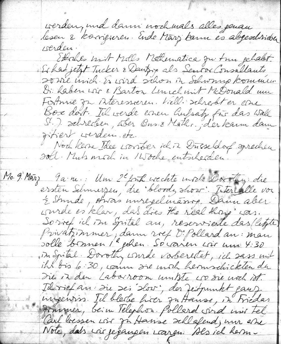 9 a.m.: Um 2h früh weckte mich Dorothy: die ersten Schmerzen, die "bloody show". Interwalle von ½ Stunde, etwas unregelmässig. Dann aber wurde es klar, daß dies "the real thing" war. So rief ich im Spital an, reservierte das (letzte) Privatzimmer; dann rief Dr Pollard an: man solle binnen 1h gehen. So waren wir um 4:30 im Spital. Dorothy wurde vorbereitet, ich sass mit ihr bis 6:30, wann sie mich heimschickten da sie in den Laborroom mußte wo sie jetzt noch ist. Ich rief an: sie sei "slow", der Zeitpunkt ganz ungewiss. Ich bleibe hier zu Hause, in Friedas Zimmer, beim Telephon. Pollard wird mir tel. Carl liessen wir zu Hause schlafend; nur eine Note, daß wir gegangen waren. Als ich heimkam schlief er noch, war aber elektrisiert als er hörte was geschah. "Er könne es kaum glauben und freue sich so sehr".