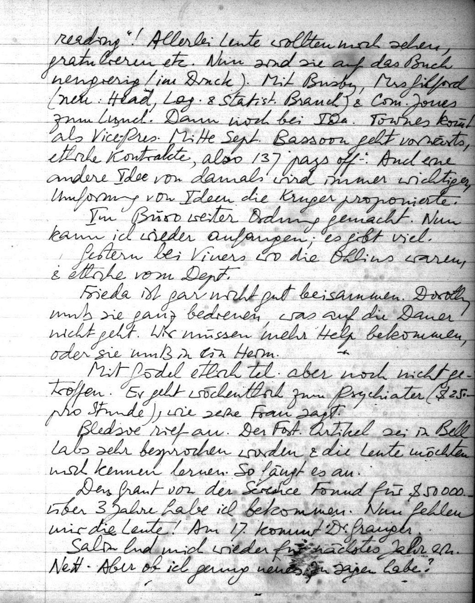 Mit Gödel etliche tel. aber noch nicht getroffen. Er geht wöchentlich zum Psychiater ($ 25,- pro Stunde), wie seine Frau sagt.