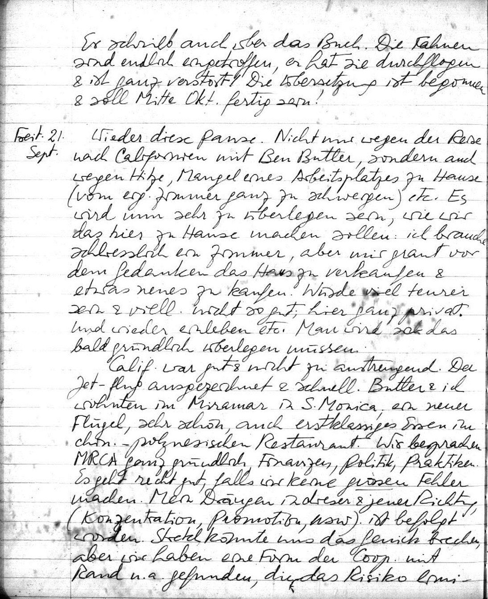 Salin lud mich wieder für nächstes Jahr ein. Nett. Aber ob ich genug neues zu sagen habe? Er schrieb auch über das Buch. Die Fahnen sind endlich eingetroffen, er hat sie durchflogen & ist ganz verstört. Die Übersetzung ist begonnen & soll Mitte Okt. fertig sein!