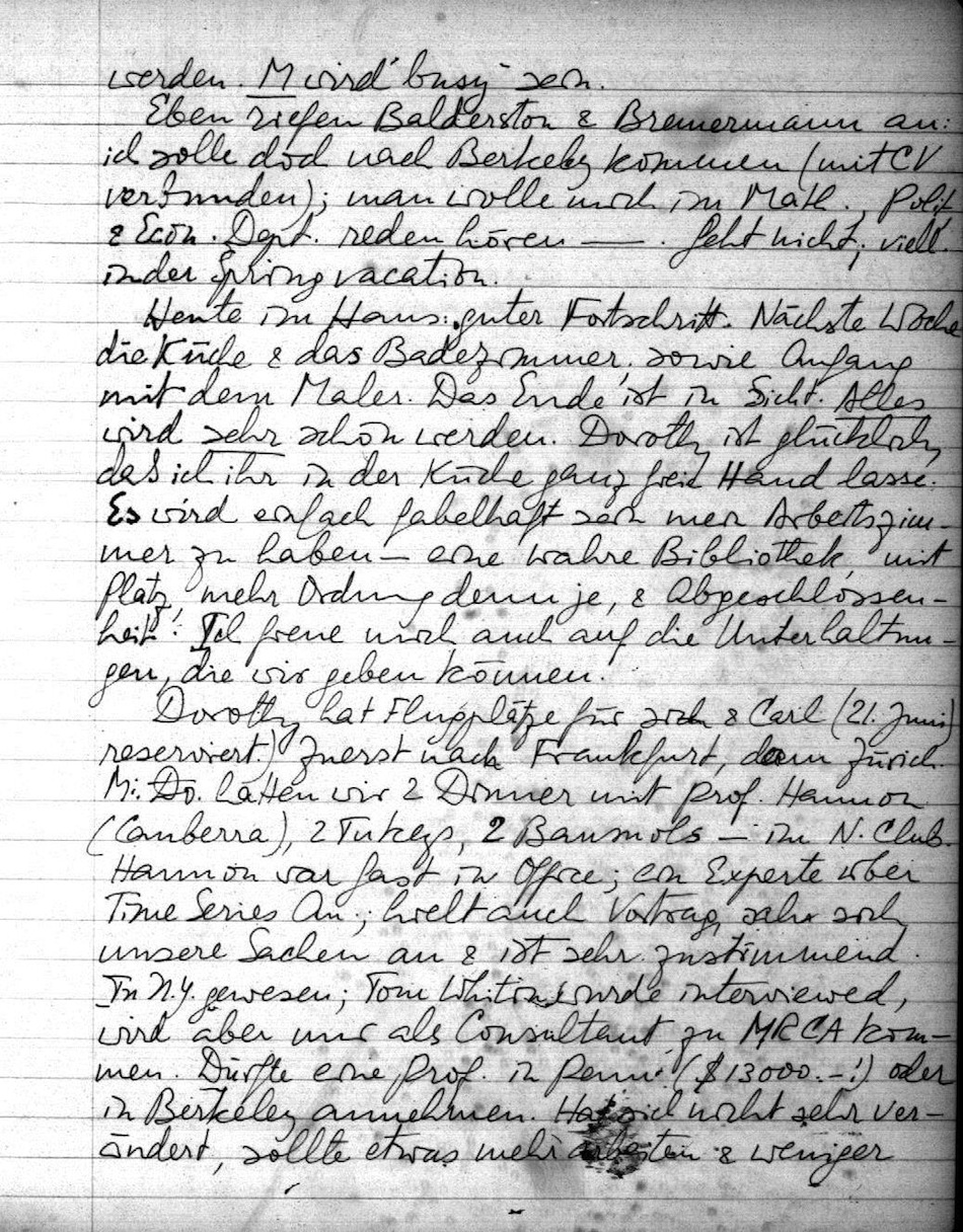 Dorothy hat Flugplätze für sich & Carl (21. Juni) reserviert. Zuerst nach Frankfurt, dann Zürich. Mi. Do. hatten wir 2 Dinner mit Prof. Hannon (Canberra), 2 Tukeys, 2 Baumols im N. Club. Hannon war fast in Office; ein Experte über Time Series An.; hielt auch Vortrag, sah sich unsere Sachen an & ist sehr zustimmend. In N.Y. gewesen; Tom Whitin wurde interviewed, wird aber nur als Consultant zu MRCA kommen. Dürfte eine Prof. in Penn. ($ 13 000,-!) oder in Berkeley annehmen. Hat sich nicht sehr verändert, sollte etwas mehr arbeiten & weniger zynisch sein. Es steht ihm schlecht. Aber er ist gut & würde MRCA enorm gut tun.