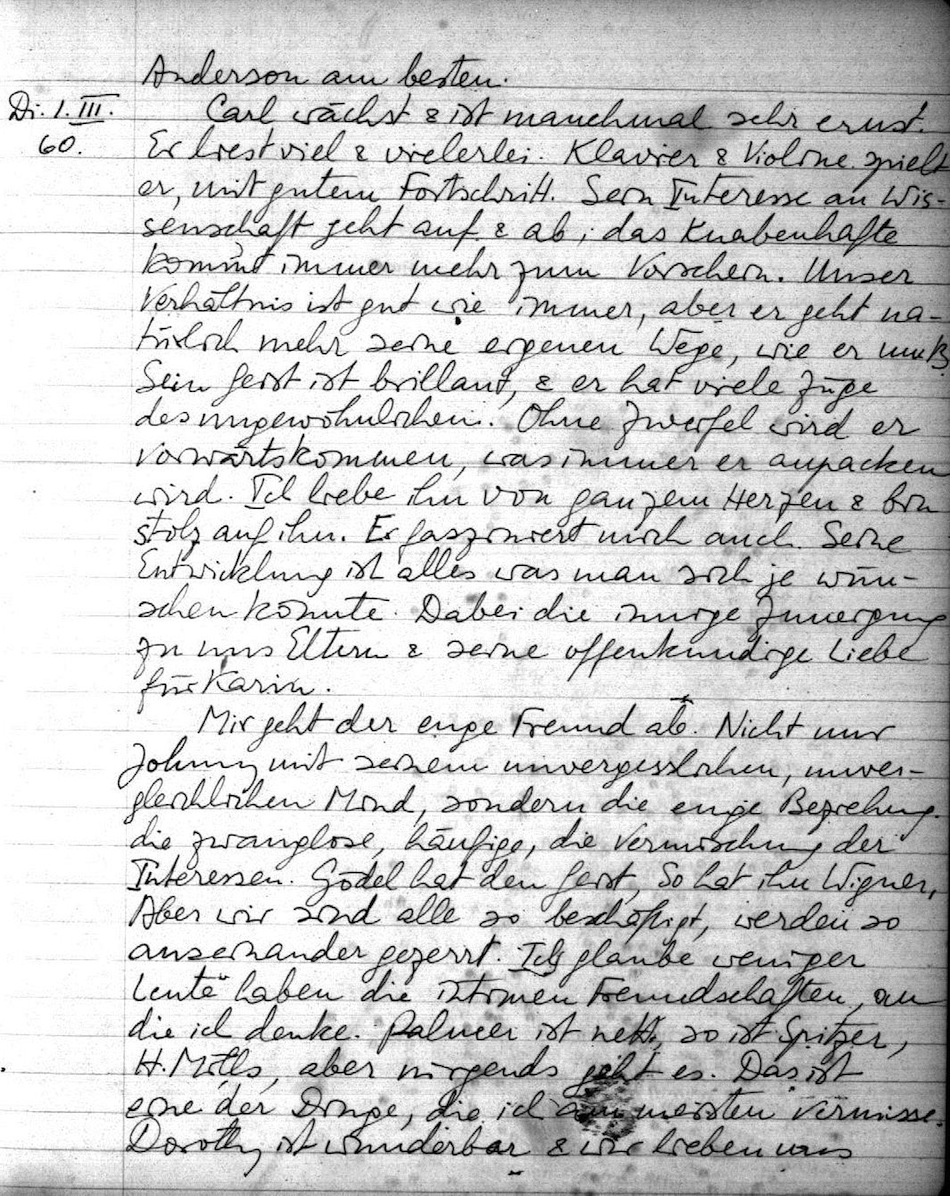 Carl wächst & ist manchmal sehr ernst. Er liest viel & vielerlei. Klavier & Violine spielt er, mit gutem Fortschritt. Sein Interesse an Wissenschaft geht auf & ab; das Knabenhafte kommt immer mehr zum Vorschein. Unser Verhältnis ist gut wie immer, aber er geht natürlich mehr seine eigenen Wege, wie er muß. Sein Geist ist brillant, & er hat viele Züge des ungewöhnlichen. Ohne Zweifel wird er vorwärtskommen, was immer er anpacken wird. Ich liebe ihn von ganzem Herzen & bin stolz auf ihn. Er fasziniert mich auch. Seine Entwicklung ist alles was man sich je wünschen könnte. Dabei die innige Zuneigung zu uns Eltern & seine offenkundige Liebe für Karin.