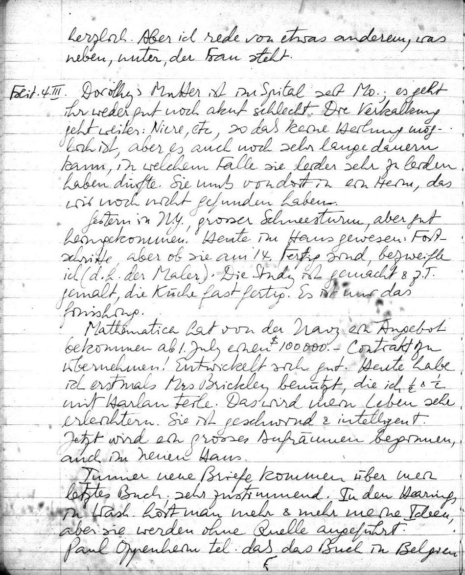 Mir geht der enge Freund ab. Nicht nur Johnny mit seinem unvergesslichen, unvergleichlichen Mind, sondern die enge Beziehung, die zwanglose, häufige, die Vermischung der Interessen. Gödel hat den Geist. So hat ihn Wigner. Aber wir sind alle so beschäftigt, werden so auseinander gezerrt. Ich glaube weniger Leute haben die intimen Freundschaften, an die ich denke. Palmer ist nett, so ist Spitzer, H. Mills, aber nirgends geht es. Das ist eines der Dinge, die ich am meisten vermisse. Dorothy ist wunderbar & wir lieben uns herzlich. Aber ich rede von etwas anderem, was neben, unter, der Frau steht.