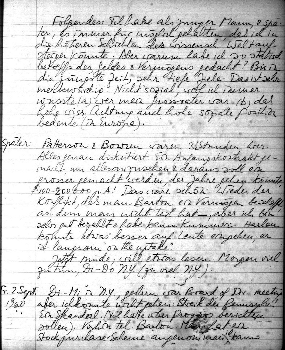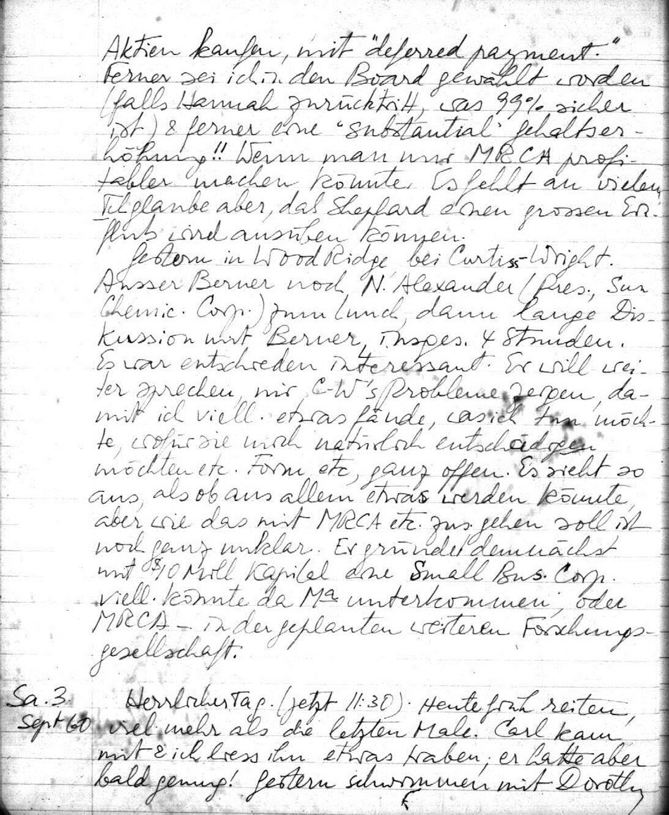 Gestern in Wood Ridge, bei Curtis-Wright. Ausser Berner noch N. Alexander (Pres., Sun Chemic. Corp.) zum Lunch, dann lange Diskussion mit Berner, insges. 4 Stunden. Es war entschieden interessant. Er will weiter sprechen, mir C-W's Probleme zeigen, damit ich viell. etwas fände, was ich tun möchte, wofür sie mich natürlich entschädigen möchten etc. Form etc., ganz offen. Es sieht so aus, als ob aus allem etwas werden könnte, aber wie das mit MRCA etc. zus.gehen soll ist noch ganz unklar. Er gründet demnächst mit $ 10 Mill. Kapital eine Small Bus. Corp., viell. könnte da Ma unterkommen, oder MRCA in den geplanten weiteren Forschungsgesellschaft.