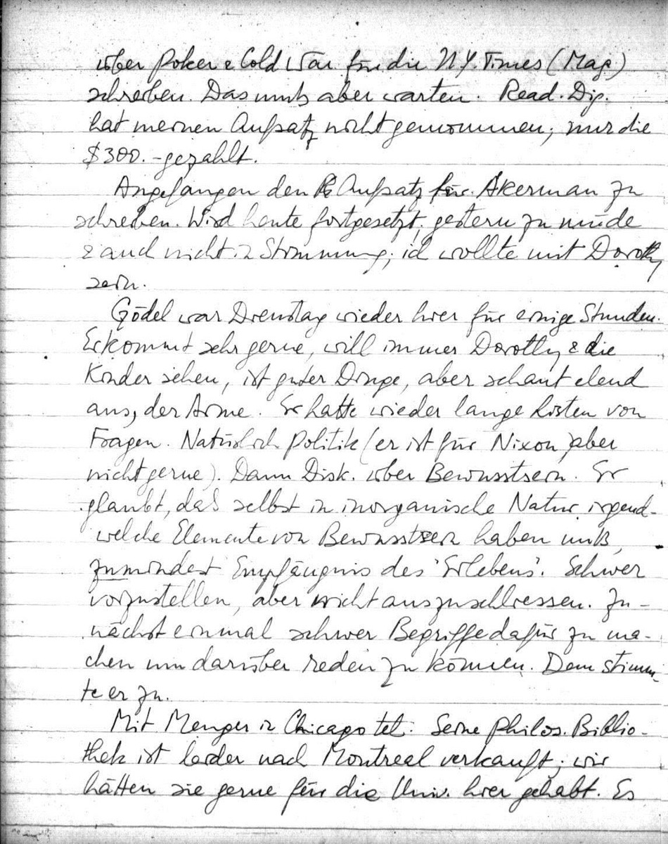 Gödel war Dienstag wieder hier für einige Stunden. Er kommt sehr gerne, will immer Dorothy & die Kinder sehen, ist guter Dinge, aber schaut elend aus, der Arme. Er hatte wieder lange Listen von Fragen. Natürlich Politik (er ist für Nixon, aber nicht gerne). Dann Disk. über Bewusstsein. Er glaubt, daß selbst in inorganische Natur irgendwelche Elemente von Bewusstsein haben muß, zumindest Empfängnis des "Erlebens". Schwer vorzustellen, aber nicht auszuschliessen. Zunächst einmal schwer Begriffe dafür zu machen, um darüber reden zu können. Dem stimmte er zu.