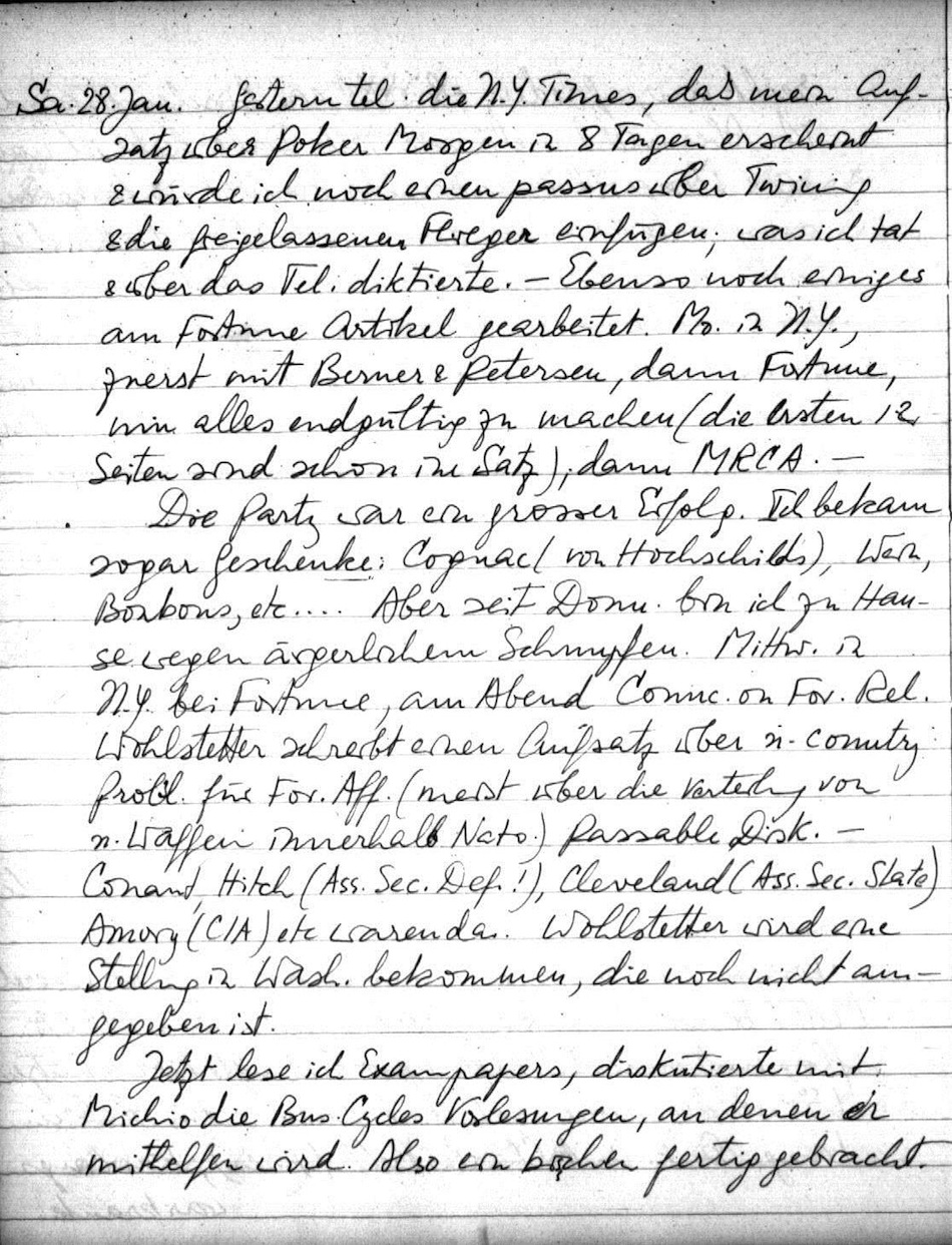 Die Party war ein grosser Erfolg. Ich bekam sogar Geschenke: Cognac (von Hochschilds), Wein, Bonbons, etc. Aber seit Donn. bin ich zu Hause wegen ärgerlichem Schnupfen. Mittw. in N.Y. bei Fortune, am Abend Counc. on For. Rel. Wohlstetter schreibt einen Aufsatz über n-country Probl. für For. Aff. (meist über die Verteilung von n-Waffen innerhalb Nato). Passable Bisk. Conand, Hitch (Ass. Sec. Def.!), Cleveland (Ass. Sec. State Amory (CIA )etc. waren da. Wohlstetter wird eine Stellung in Wash. bekommen, die noch nicht angegeben ist.