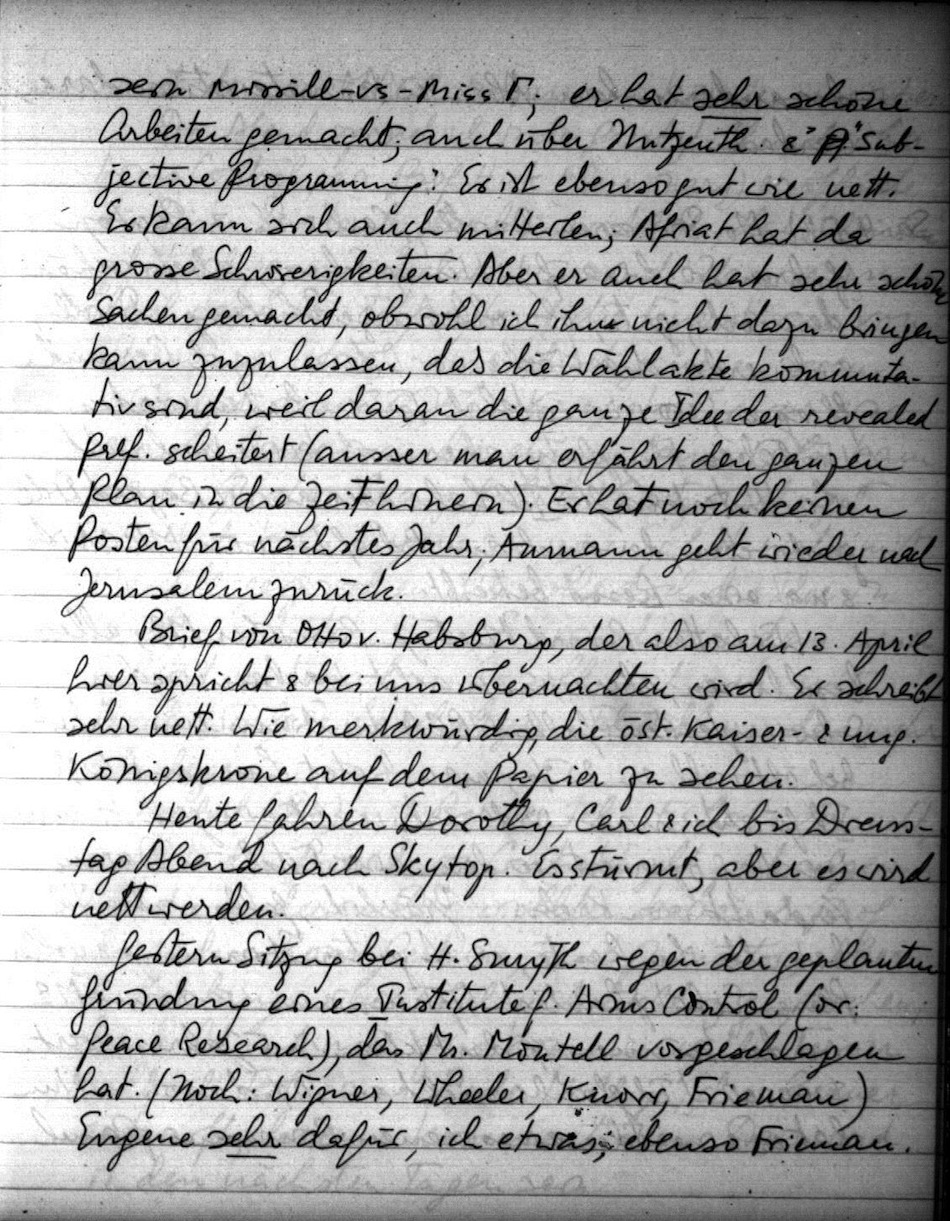Gestern Sitzung bei H. Smyth wegen der geplanten Gründung eines Institute f. Arms Control (or: Peace Research), das Mr. Montell vorgeschlagen hat. (Noch: Wigner, Wheeler, Knorr, Frieman). Eugene sehr dafür, ich etwas; ebenso Frieman, die anderen lau. Aber es könnte etwas daraus werden.