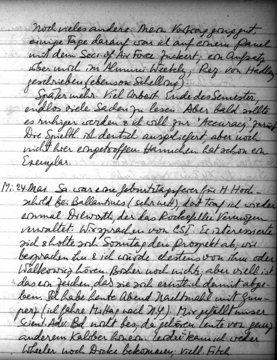 Sa. war eine Geburtstagsfeier für H. Hochschild bei Ballantines (sehr nett); dort traf ich wieder einmal Dilworth, der das Rockefeller Vermögen verwaltet. Wir sprachen von CSI. Er interessierte sich & holte sich Sonntag den Prospekt ab; wir besprachen ihn & ich würde ehestens von ihm oder Walkowicz hören. Bisher noch nichts; aber viell. ist das ein Zeichen, daß sie sich ernstlich damit abgeben. Ich habe heute Abend Nachtmahl mit Gumperz (ich fahre Mittag nach N.Y.). Mir gefällt unser Scient. Adv. Bd. nicht bes.; da gehören Leute von ganz anderem Kaliber hinein. Leider kann ich weder Wheeler noch Dicke bekommen; viell. Fitch.