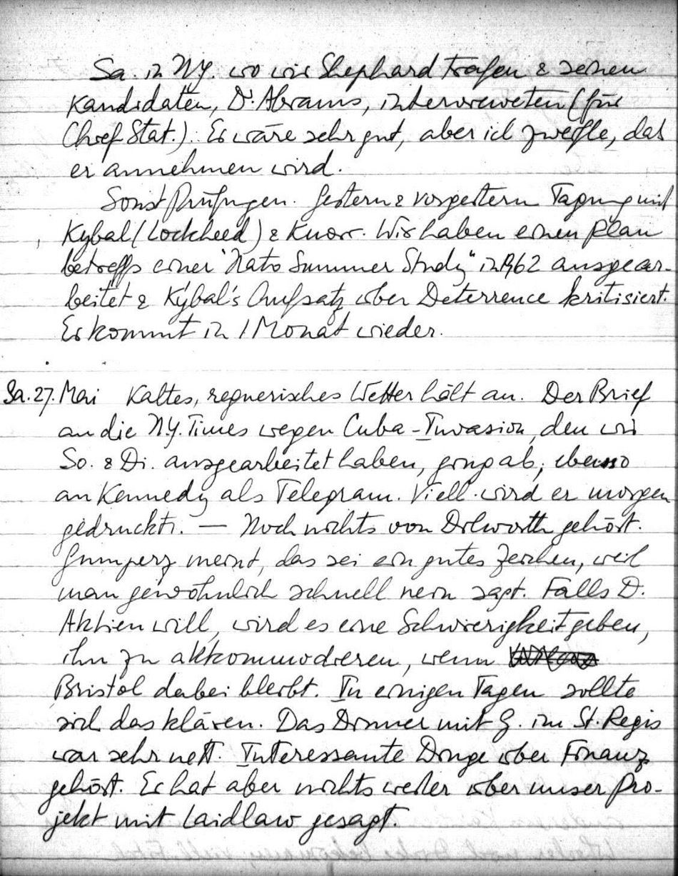 Sonst Prüfungen. Gestern & vorgestern Tagung mit Kybal (Lockheed) & Knorr. Wir haben eine Plan betreffs einer "Nato Summer Study" in 1962 ausgearbeitet & Kybal's Aufsatz über Deterrence kritisiert. Er kommt in 1 Monat wieder.