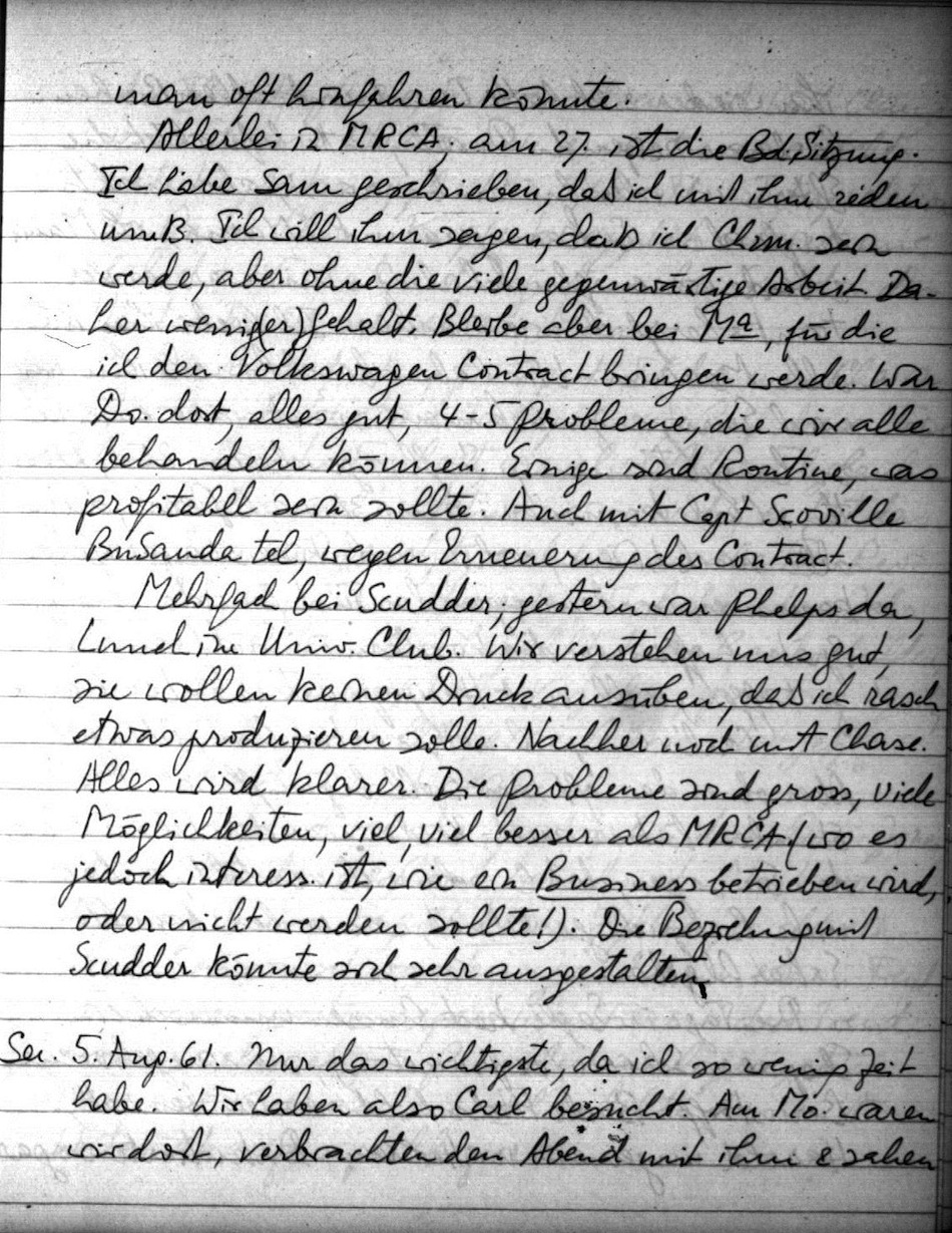 Allerlei in MRCA; am 27. ist die Bd. Sitzung. Ich habe Sam geschrieben, daß ich mit ihm reden muß. Ich will ihm sagen, daß ich Chrm. sein werde, aber ohne die viele gegenwärtige Arbeit. Daher wenig(er) Gehalt. Bleibe aber bei Ma für die ich den Volkswagen Contract bringen werde. War Do. dort, alles gut, 4-5 Probleme, die wir alle behandeln können. Einige sind Routine, was profitabel sein sollte. Auch mit Capt. Scoville BuSanda tel., wegen Erneuerung des Contract.