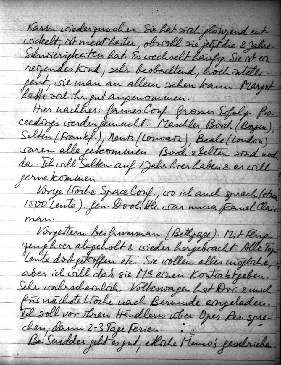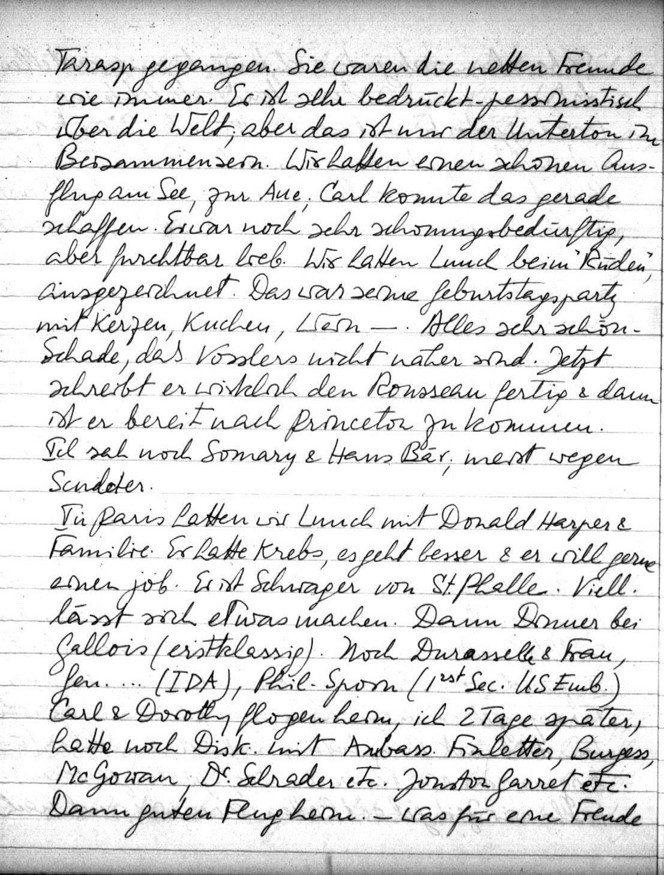 In Paris hatten wir Lunch mit Donald Harper & Familie. Er hatte Krebs, es geht besser & er will gerne einen job. Er ist Schwager von St. Phalles. Viell. lässt sich etwas machen. Dann Dinner bei Gallois (erstklassig). Noch Durasselle & Frau, Gen. (IDA9, Phil. Sporn (1rst Sec. US Emb.). Carl & Dorothy flogen heim, ich 2 Tage später, hatte noch Disk. mit Ambass. Finletter, Burgess, McGowan, Dr Schrader etc. Jonston Garret etc. Dann guten Flug heim. Was für eine Freude Karin wieder zusehen. Sie hat sich glänzend entwickelt, ist meist heiter, obwohl sie jetzt die 2 Jahre-Schwierigkeiten hat. Es wechselt häufig. Sie ist ein reizendes Kind, sehr beobachtend, hochintelligent, wie man an allem sehen kann. Margot hatte sich ihr gut angenommen.