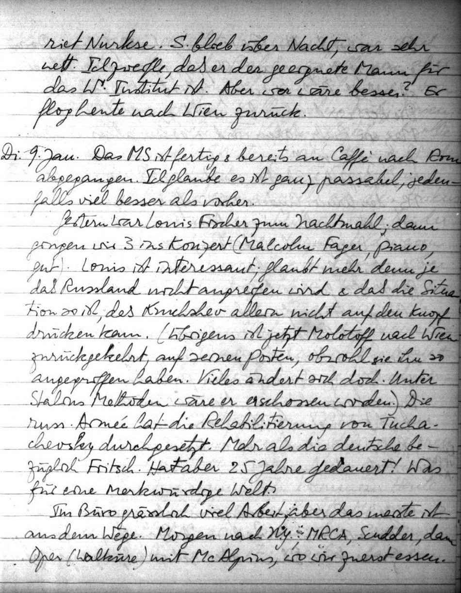 Gestern war Lonis Fischer zum Nachtmahl; dann gingen wir 3 ins Konzert (Malcolm, Fager, Piano, gut). Lonis ist interessant; glaubt mehr denn je daß Russland nicht angreifen wird & daß die Situation so ist, daß Kruchshev allein nicht auf den Knopf drücken kann. (Übrigens ist jetzt Molotoff nach Wien zurückgekehrt, auf seinen Posten, obwohl sie ihn angegriffen haben. Vieles ändert sich doch. Unter Stalins Methoden wäre er erschossen worden.) Die russ. Armee hat die Rehabilitierung von Tuchachevsky durchgesetzt. Mehr als die deutsche bezüglich Fritsch. Hat aber 25 Jahre gedauert! Was für eine merkwürdige Welt.