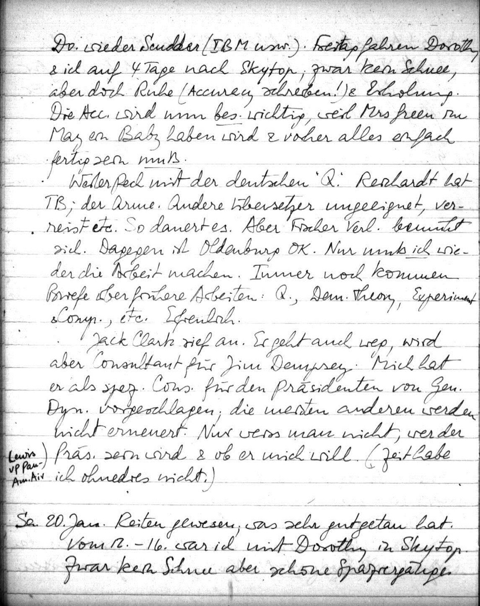 Im Büro grässlich viel Arbeit, aber das meiste ist aus dem Wege. Morgen nach N.Y.; MRCA, Scudder, dann Oper (Walküre) mit McAlpins, wo wir zuerst essen. Do. wieder Scudder (IBM usw.). Freitag fahren Dorothy & ich auf 4 Tage nach Skytop; zwar kein Schnee, aber doch Ruhe (Accuracy schreiben!) & Erholung. Die Acc. wird nun bes. wichtig, weil Mrs. Green im May ein Baby haben wird & vorher alles einfach fertig sein muß.