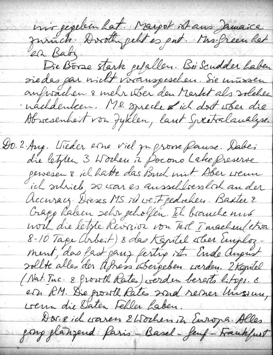Wieder eine viel zu grosse Pause. Dabei die letzten 3 Wochen in Pocono Lake Preserve gewesen & ich hatte das Buch mit. Aber wenn ich schrieb, so war es ausschliesslich an der Accuracy. Dieses MS ist weit gediehen. Baxter & Cragg haben sehr geholfen. Ich brauche nur noch die letzte Revision von Teil I machen (etwa 8-10 Tage Arbeit) & das Kapitel über Employment, das fast ganz fertig ist. Ende August sollte alles der UPress übergeben werden. 2 Kapitel (Nat. Inc. & growth Rates) werden bereits litogr. & ein RM. Die growth Rates sind reiner Unsinn wenn die Daten Fehler haben.
