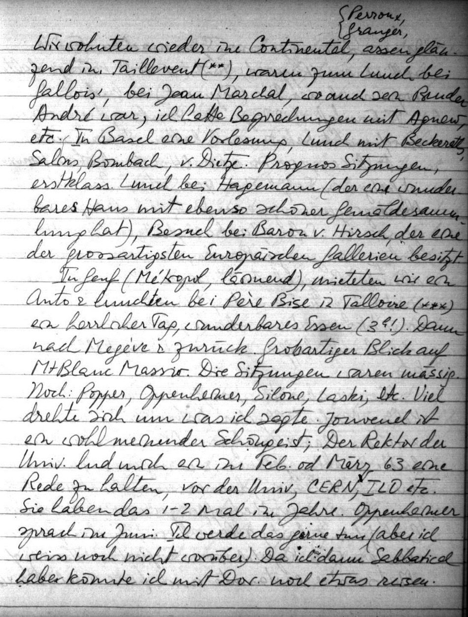 In Genf (Métropol, lärmend), mieteten wir ein Auto & lunchten bei Pere Bise in Talloire (***), ein herrlicher Tag, wunderbares Essen (3h!). Dann nach Megéve & zurück. Großartiger Blick auf Mt. Blanc Massiv. Die Sitzungen waren mässig. Noch: Popper, Oppenheimer, Silone, Laski, etc. Viel drehte sich um was ich sagte. Jouvenel ist ein wohlmeinender Schöngeist; Der Rektor lud mich ein im Feb. od. März 63 eine Rede zu halten, vor der Univ., CERN, ILD etc. Sie haben das 1-2 Mal im Jahre. Oppenheimer sprach im Juni. Ich werde das gerne tun (aber ich weiss noch nicht worüber). Da ich dann Sabbatical haben könnte ich mit Dor. noch etwas reisen. Das würde uns grossen Spass machen. Ferner soll ich am (Rappard)-Institut 3-4 Vorträge halten wozu mich der Dir. (Freymont) einlud.
