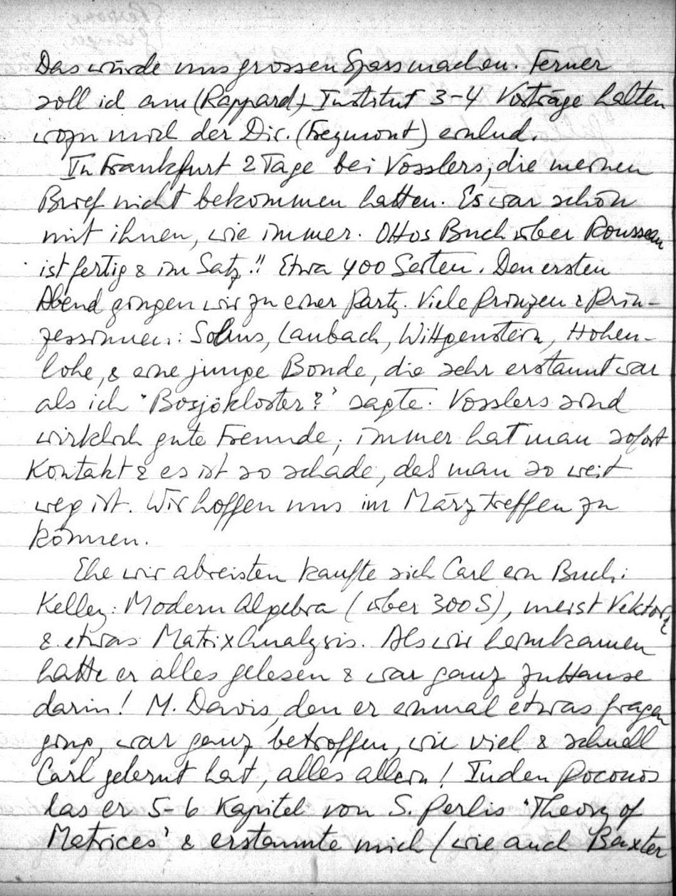 In Frankfurt 2 Tage bei Vosslers, die meinen Brief nicht bekommen hatten. Es war schön mit ihnen, wie immer. Ottos Buch über Rousseau ist fertig & im Satz!! Etwa 400 Seiten. Den ersten Abend gingen wir zu einer Party. Viele Prinzen & Prinzessinnen: Solins, Laubach, Wittgenstein, Hohenlohe, & eine junge Blonde, die sehr erstaunt war als ich "Bosjökloster"? sagte. Vosslers sind wirklich gute Freund; immer hat man sofort Kontakt & es ist so schade, daß man so weit weg ist. Wir hoffen uns im März treffen zu können.