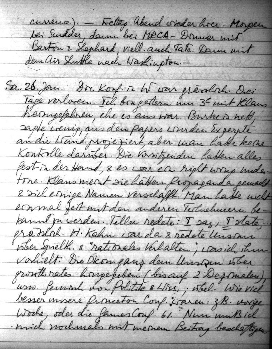 Die Kof. in W. war grässlich. Drei Tage verloren. Ich bin gestern um 3h mit Klaus heimgefahren, ehe es aus war. Burke ist nett, sagte wenig; aus den Papers wurden Exzerpte an die Wand projeziert, aber man hatte keine Kontrolle darüber. Die Vorsitzenden hatten alles fest in der Hand, & es war ein right wing undertone. Klaus meint sie hätten Propaganda gemacht & sich einige Namen verschafft. Man hatte nicht einmal Zeit mit den anderen Teilnehmern bekannt zu werden. Teller redete: I say, I state, grässlich. H. Kahn war da & redete Unsinn über Spielth. & "rationales Verhalten", was ich ihm vorhielt. Die Ökon. ganz dem Unsinn über growth rates hingegeben (bis auf 2 Dezimalen), usw. Gemisch von Politik & Wiss.; übel. Wie viel besser unsere Princeton Conf. waren: z.B. vorige Woche, oder die Games Conf. 61. Nun muß ich mich nochmals mit meinem Beitrag beschäftigen, einige Ergänzungen machen. Dann ein Vorwort zu Jacot; aber das ist schon G theory.