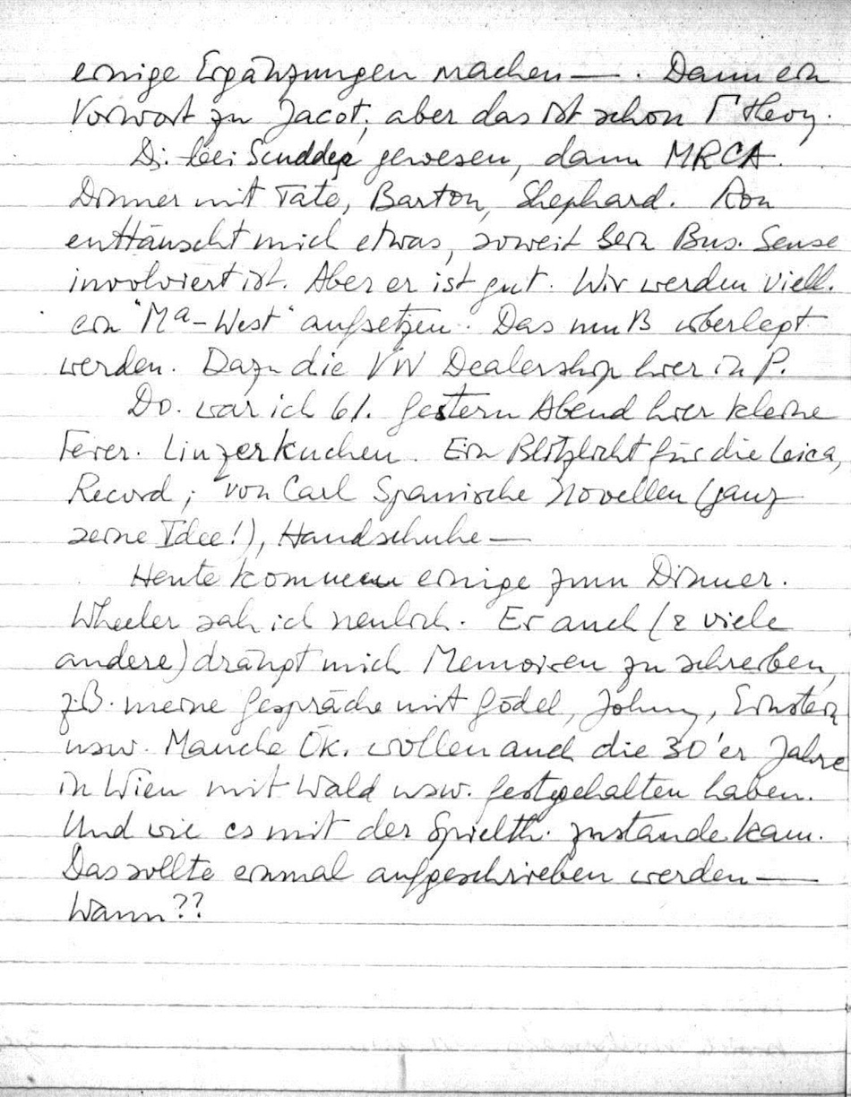 heute kommen einige zum Dinner. Wheeler sah ich neulich Er auch (& viele andere) drängt mich Memoiren zu schreiben, z.B. meine Gespräche mit Gödel, Johnny, Einstein usw. Manche Ök. wollen auch die 30'er Jahre in Wien mit Wald usw. festgehalten haben. Und wie es mit der Spielth. zustande kam. Das sollte einmal aufgeschrieben werden. Wann??
